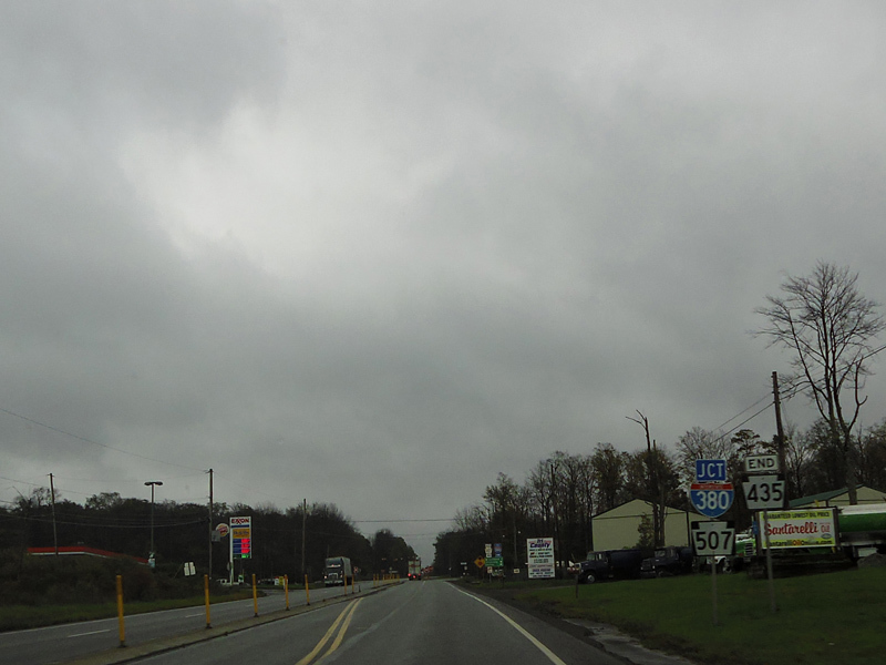 Drinker Turnpike ends at a stop sign and a flasher. Turn right to continue on PA 435 to I-380. Turn left for Main Street (PA 507), which begins here.