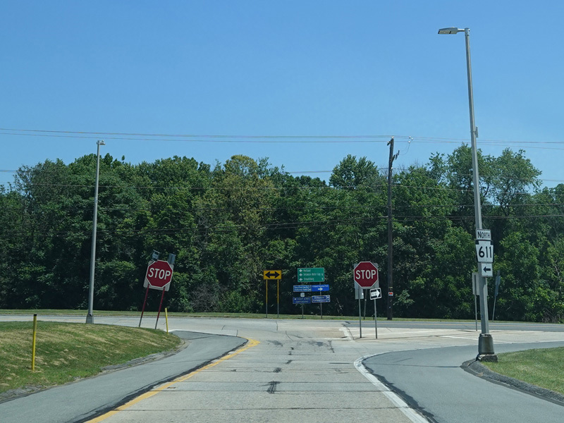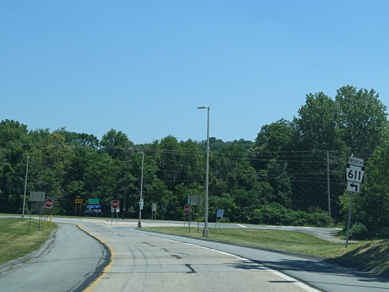 The exit ramp ends at a stop sign. Turn left onto North Delaware Drive to stay on PA 611. River Road is to the right.