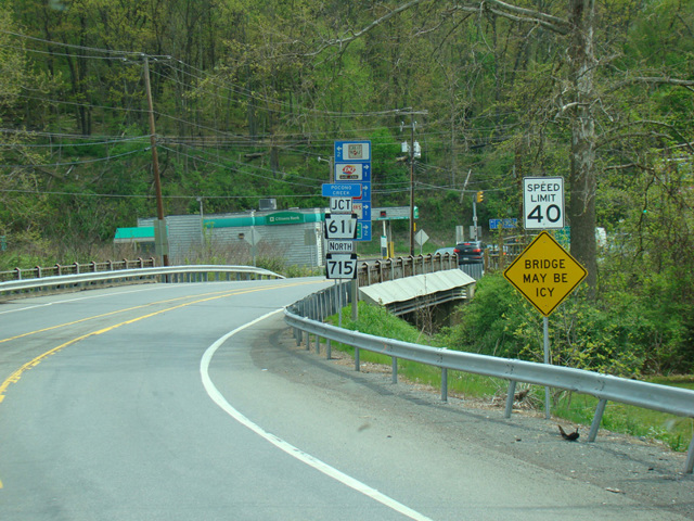 PA 715 begins at US 209 in Brodheadsville and runs north and east to Tannersville. There, it has an interchange with the Keystone Shortway (I-80) and is then multiplexed with PA 611 for one block. It then splits off and runs northeast to Henryville, where it ends PA 191. The entire length is a two-lane undivided road that has no name and is known solely by its number.