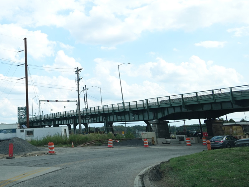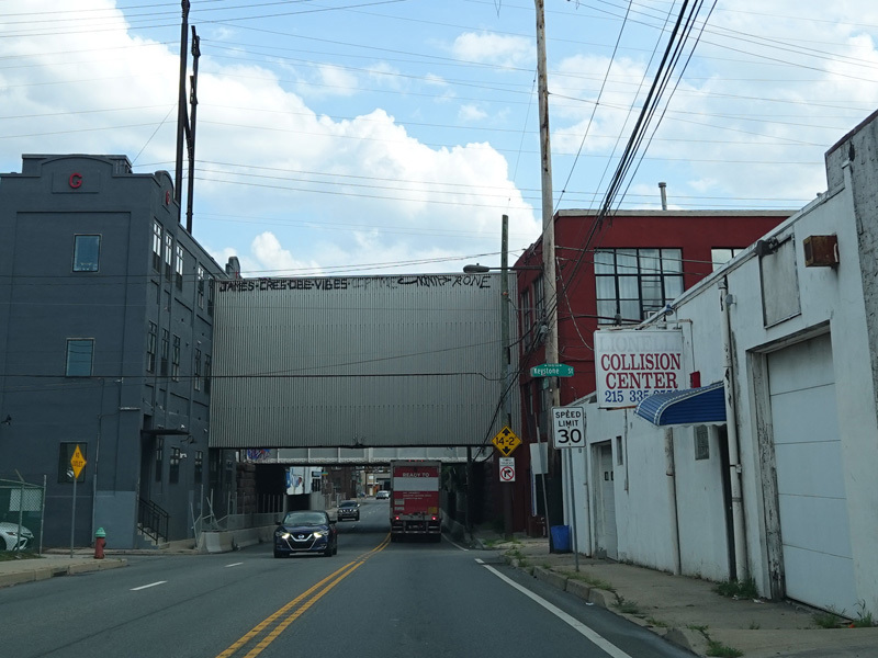 Elbridge Street is a two-lane undivided road that loops around, passing under the Tacony-Palmyra Bridge.