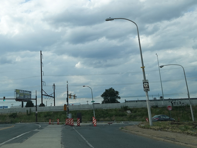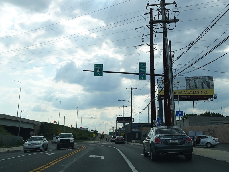 The roadway splits. Bear left onto New State Road to stay on PA 73. Bear right to stay on State Road for access to the Delaware Expressway (I-95) south.