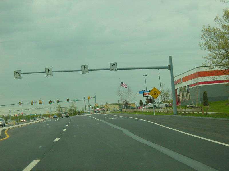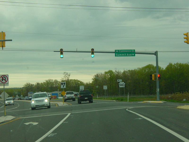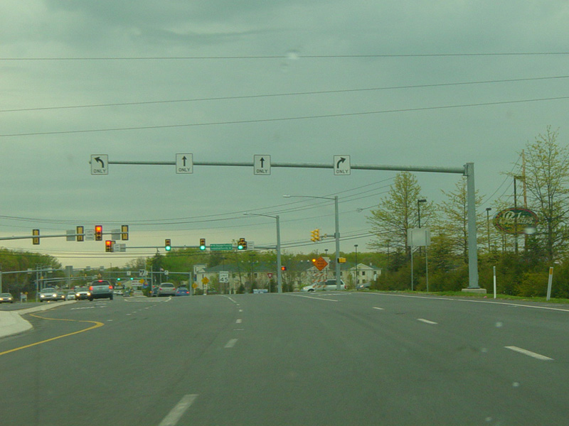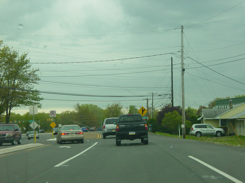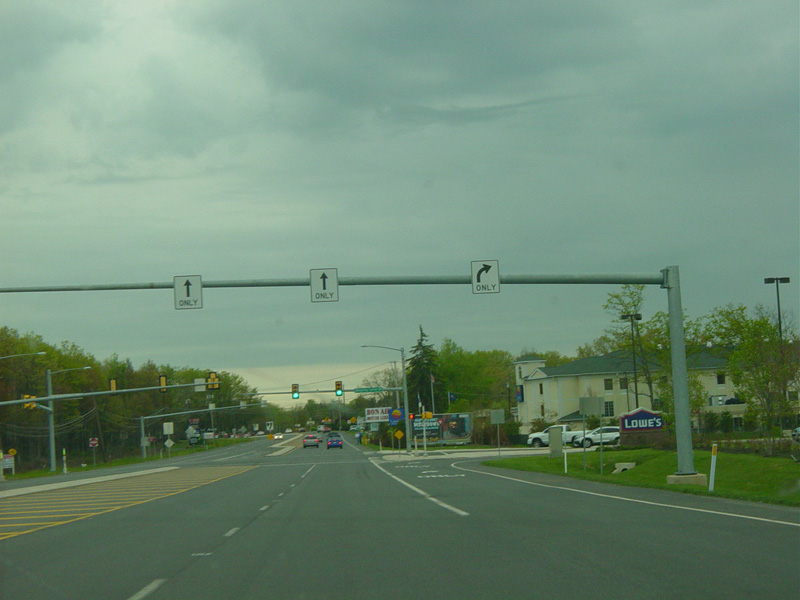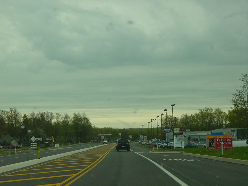 Pocono Summit Road narrows down to two lanes but remains divided. There are traffic lights at Commerce Street, Summit Avenue, and Harvest Lane. There is misleading signage that might be misread to imply that Harvest Lane is PA 314, although it is just a local street.