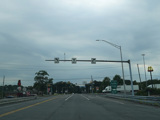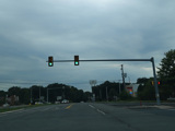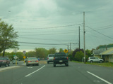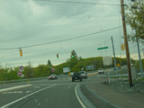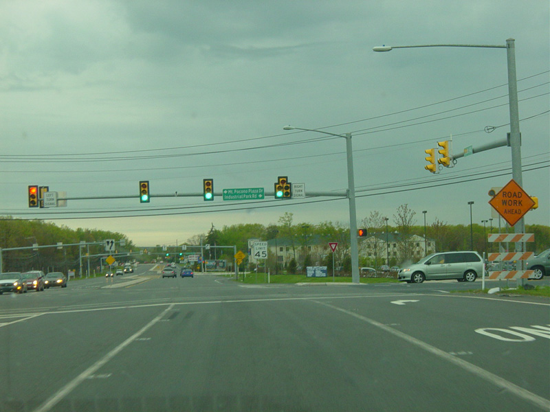 Pocono Summit Road runs west through Mount Pocono as a four-lane divided road. There are traffic lights at Oak Street, Mount Pocono Plaza Drive, Industrial Park Road, and Shopping Center Drive.