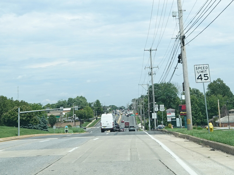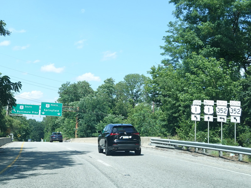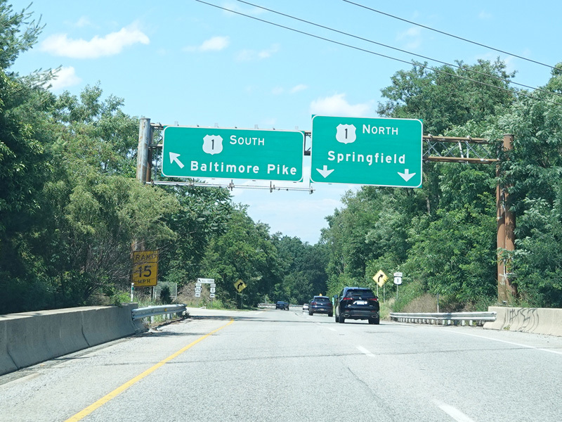 US 322 splits off to the right onto Conchester Highway at a traffic light. Continue straight ahead on Baltimore Pike to stay on US 1.