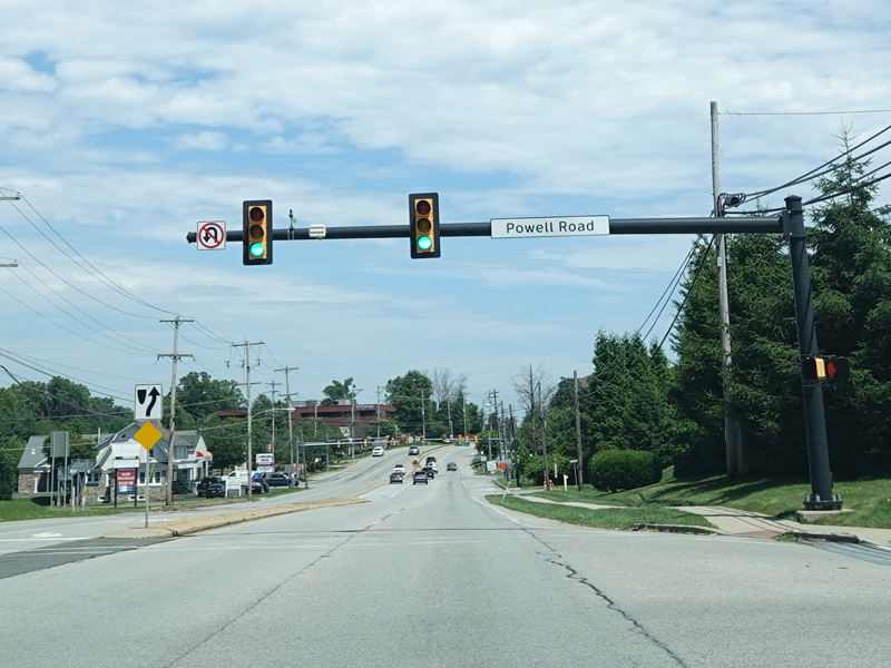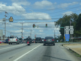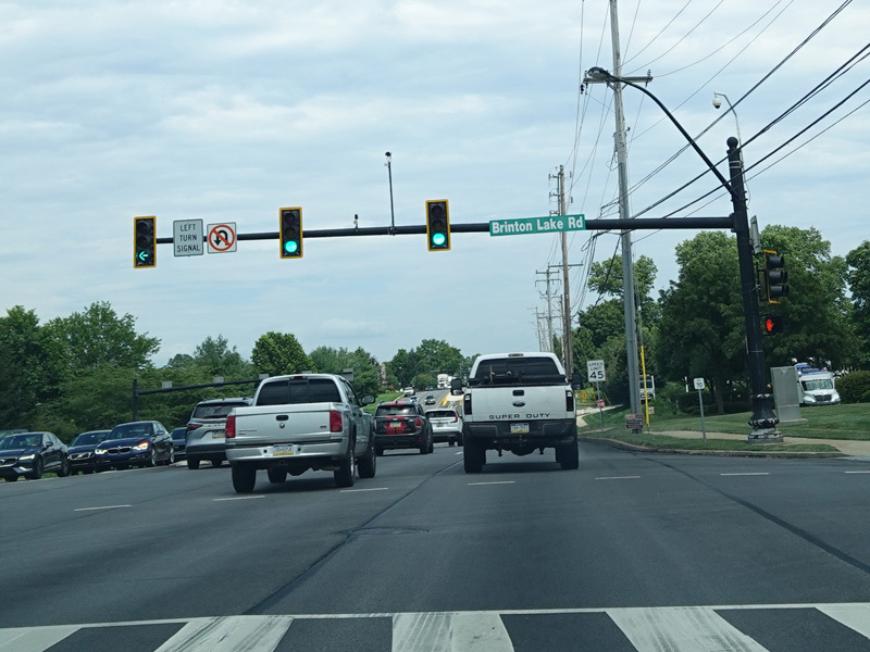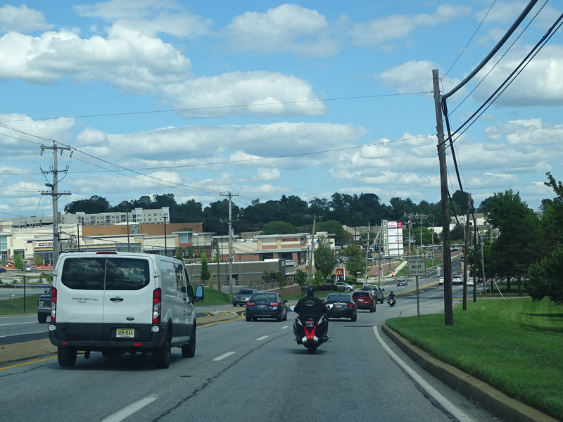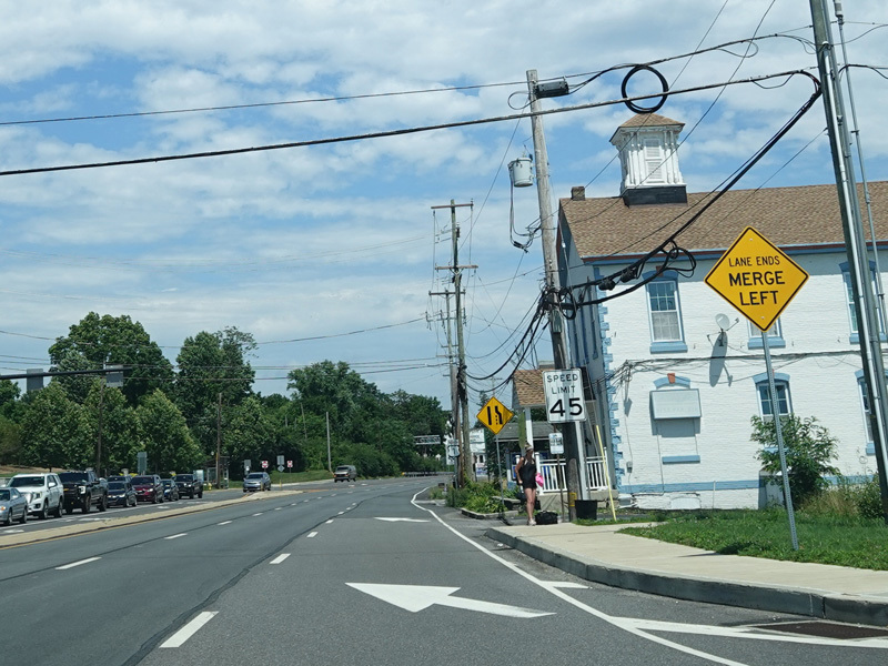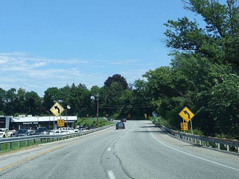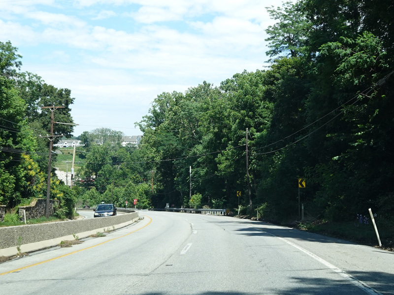 Baltimore Pike narrows down to four lanes. There are traffic lights at Concord Road, Cheyney Road, Powell Road, Stoney Bank Road, Lydia Hollow Drive, Walnut Hill Boulevard, Valleybrook Road, and Red Roof Drive.