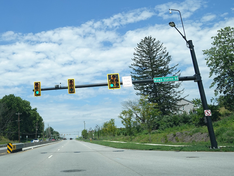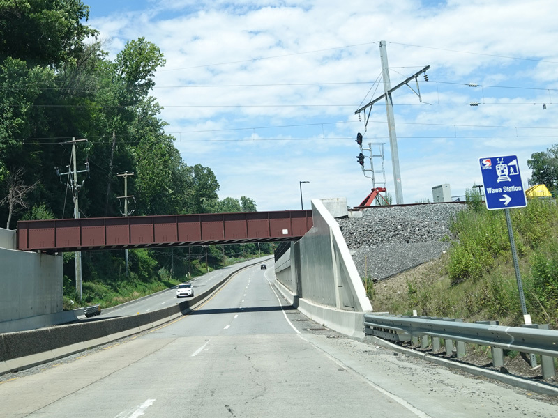 Baltimore Pike passes under railroad tracks of the SEPTA Media/Wawa Line. Immediately, there is a traffic light at Wawa Station Road.