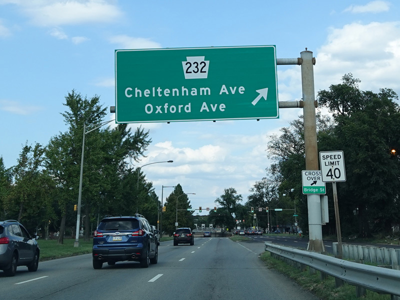 The main road passes under a traffic circle where the service road intersects Cheltenham Avenue and Oxford Avenue (PA 232).