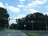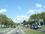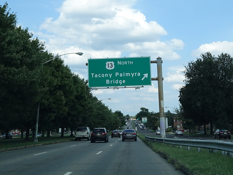 The Roosevelt Expressway ends here, merging with Roosevelt Boulevard, which is designated US 13 to the south of here. The two routes are multiplexed straight ahead. Beginning here, Roosevelt Boulevard has a service road in each direction that must be used to make right turns. The main road is used for through traffic and left turns.