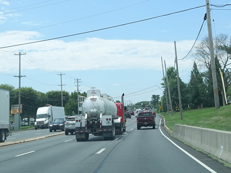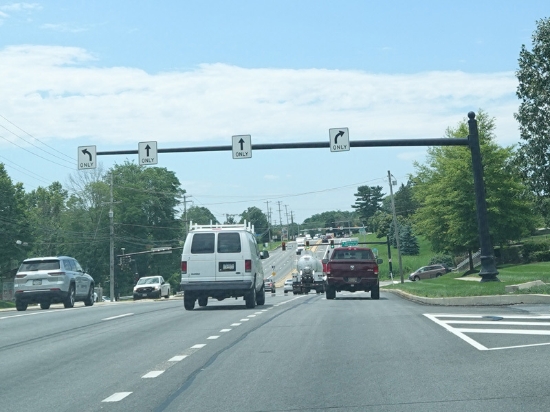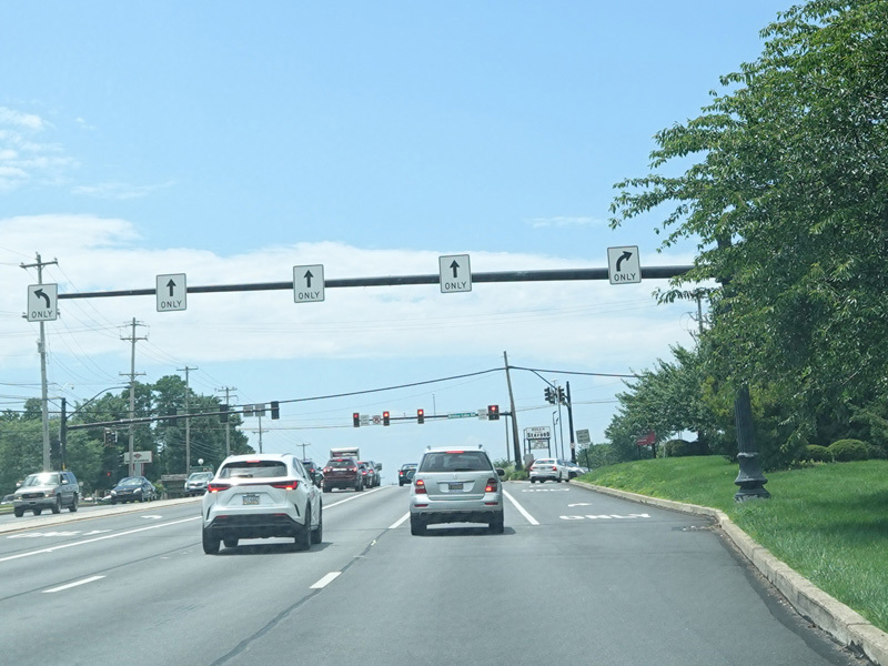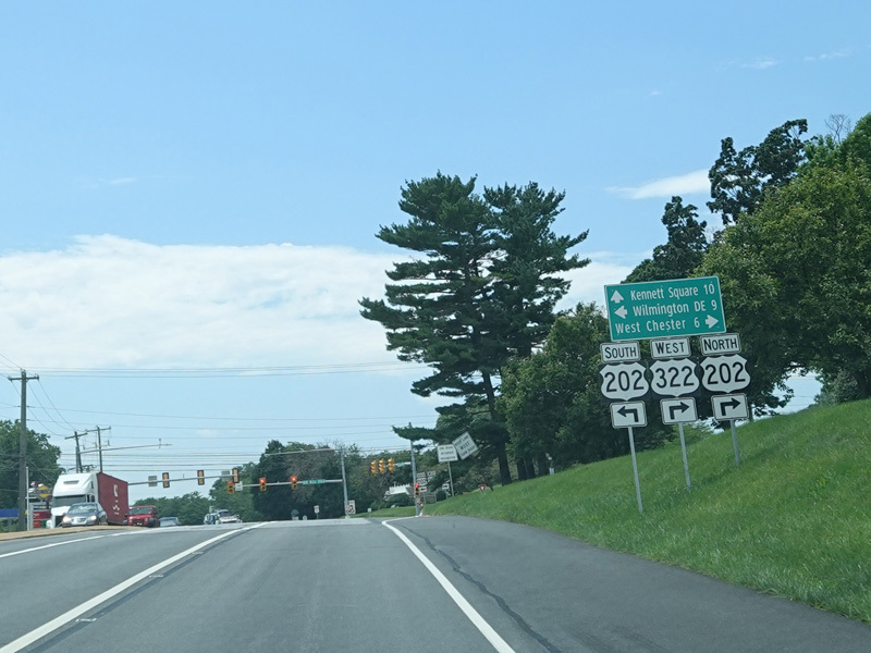 Skipping a number of miles to the south, US 322 is multiplexed with US 1 along Baltimore Pike. There are traffic lights at Evergreen Drive, Brinton Lake Road, Applied Bank Boulevard, and State Farm Drive.