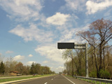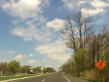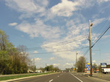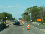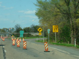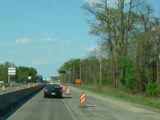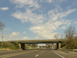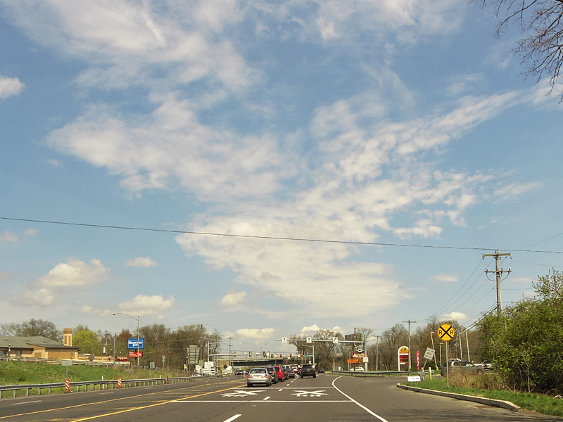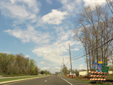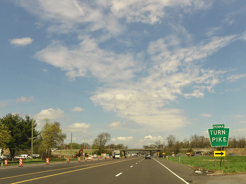These pictures show Bristol Pike at its interchange with the Pennsylvania Turnpike (I-95) as it appeared while construction work was in progress in the area. The roadway was narrowed down to one lane in each direction at the time. The grade-separated interchange with the ramp has since been replaced with a traffic light.
