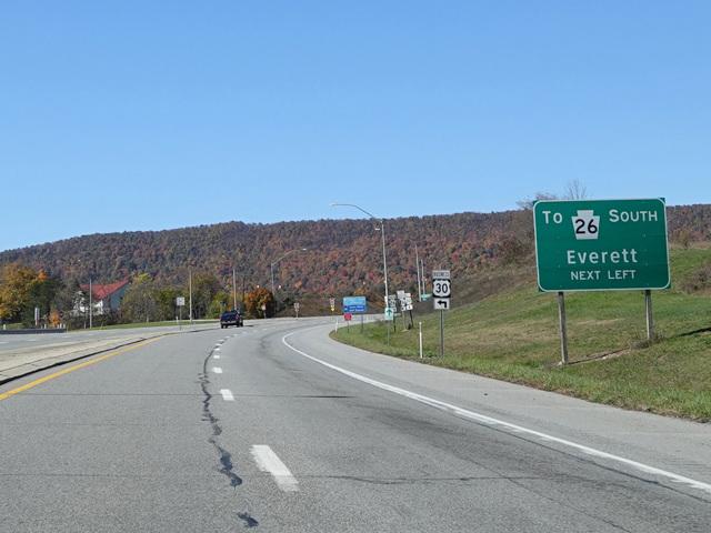 US 30 continues east, running north of and parallel to the Pennsylvania Turnpike (I-76). In Bedford, it crosses the turnpike several times. In Breezewood, there is an infamous interchange where I-70 ends at US 30 and then begins again after about a quarter of a mile, requiring motorists following I-70 to pass through traffic lights. US 30 continues east, passing through Chambersburg, where there is an interchange with I-81, and then Gettysburg, the site of the famous battle in the American Civil War where Abraham Lincoln gave his Gettysburg Address.