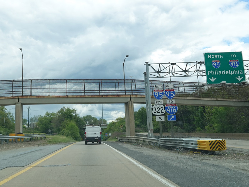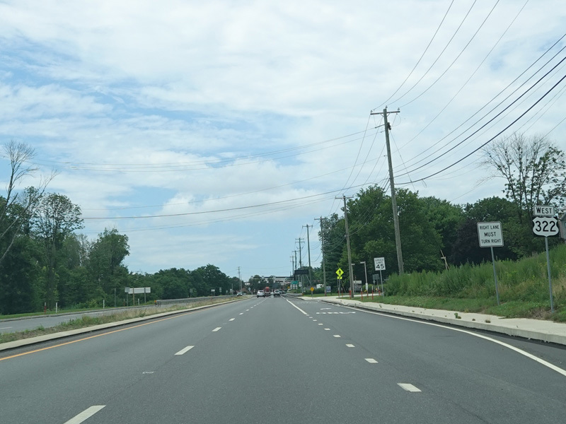 The roadway ends at an interchange at the Delaware Expressway (I-95). Bear right to go north toward the Mid-County Expressway (I-476). Bear left to go south and to stay on US 322.