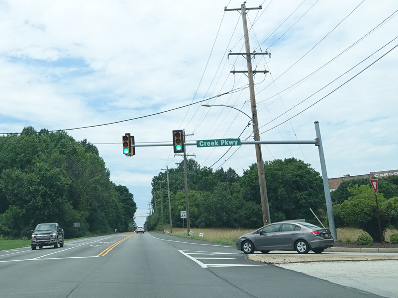 There are some traffic lights along this stretch, including one at Creek Parkway. There are also uncontrolled intersections at Summers Lane and Colonial Drive.