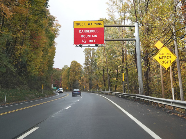 US 40 is a major east/west route running most of the way across the country from Park City, Utah, to Atlantic City, New Jersey. It has a relatively short section in Pennsylvania, entering the state from the Northern Panhandle of West Virginia and runs east to Washington, Pennsylvania, where it is multiplexed with US 19 along Jefferson Avenue, West Maiden Street, and East Maiden Street through the downtown area. Then, it splits off and runs diagonally to the southeast. There is a short multiplex along with US 119 expressway where it loops around Uniontown. US 40 has a business route through Uniontown in this area. Then, US 40 crosses Chestnut Ridge in the Allegheny Mountains before reaching the state line with Maryland.