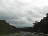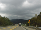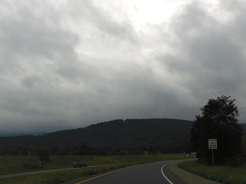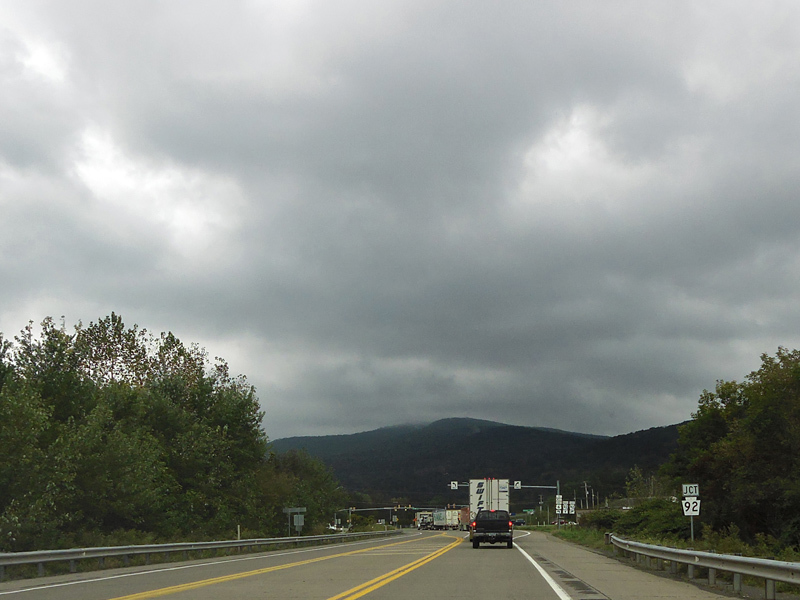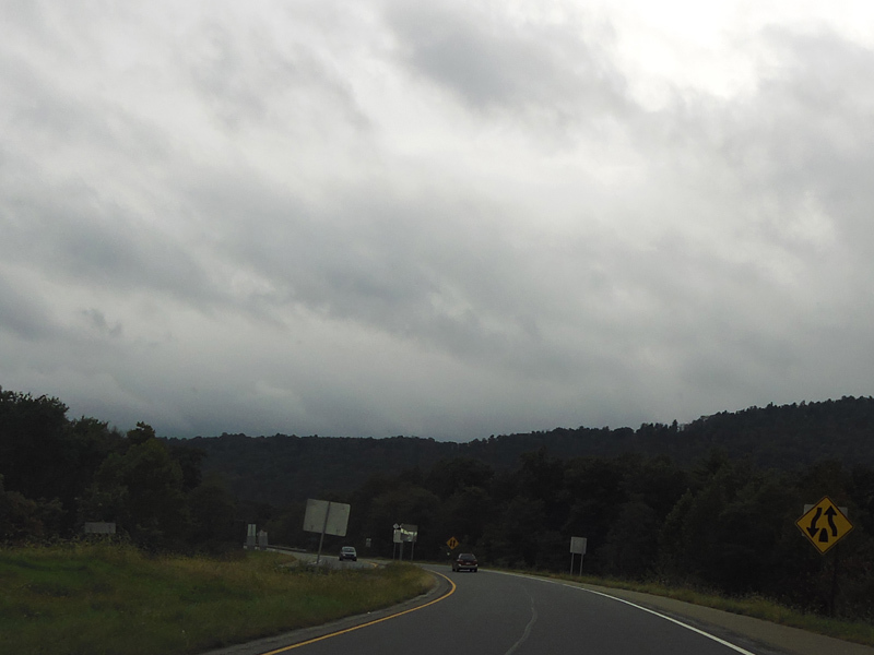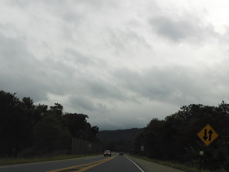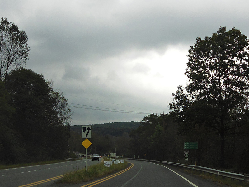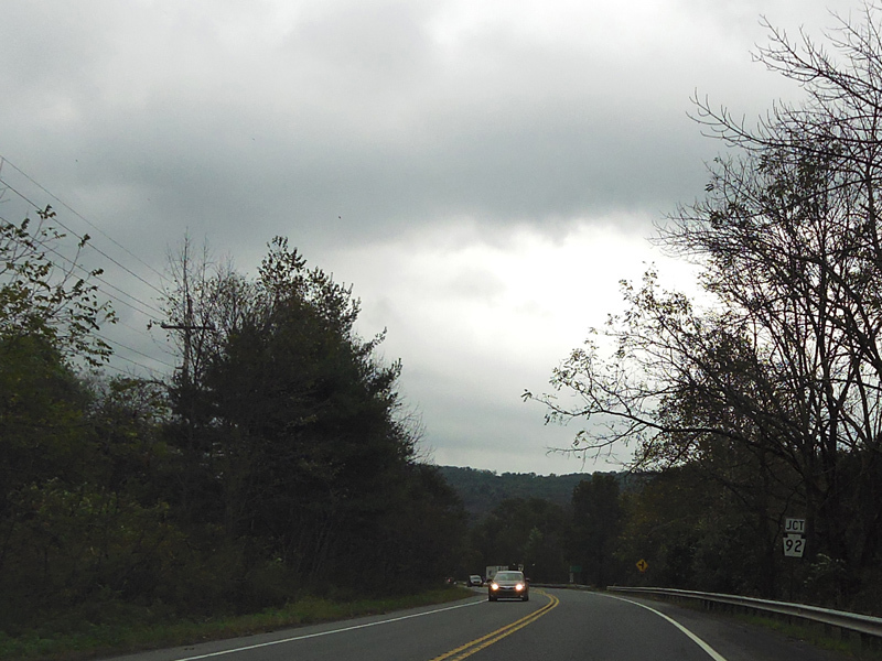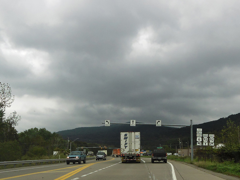 The road becomes divided with a grass median, and then the two routes split. Turn left for PA 92. Continue straight ahead to stay on US 6.