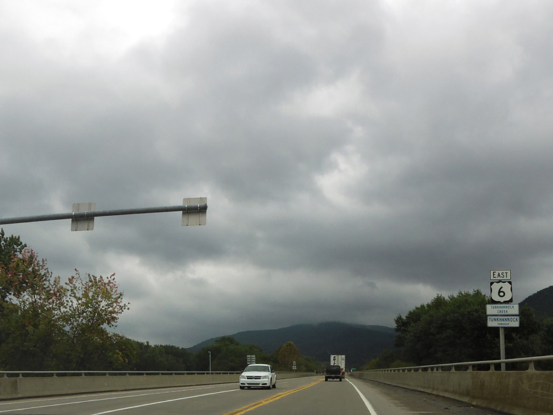 US 6/PA 92 runs east as a two-lane undivided road. There are three bridges over Tunkhannock Creek, which winds its way through the area.