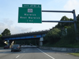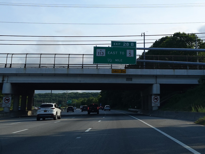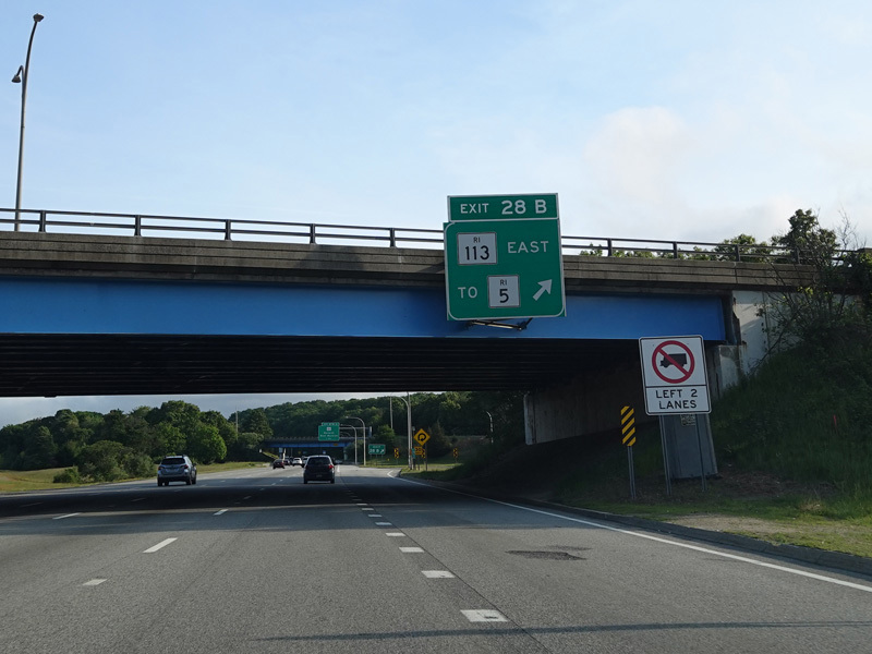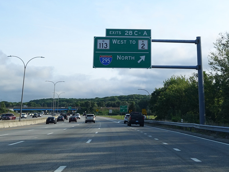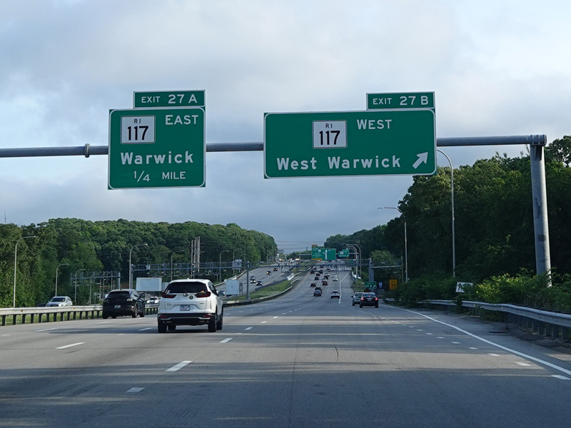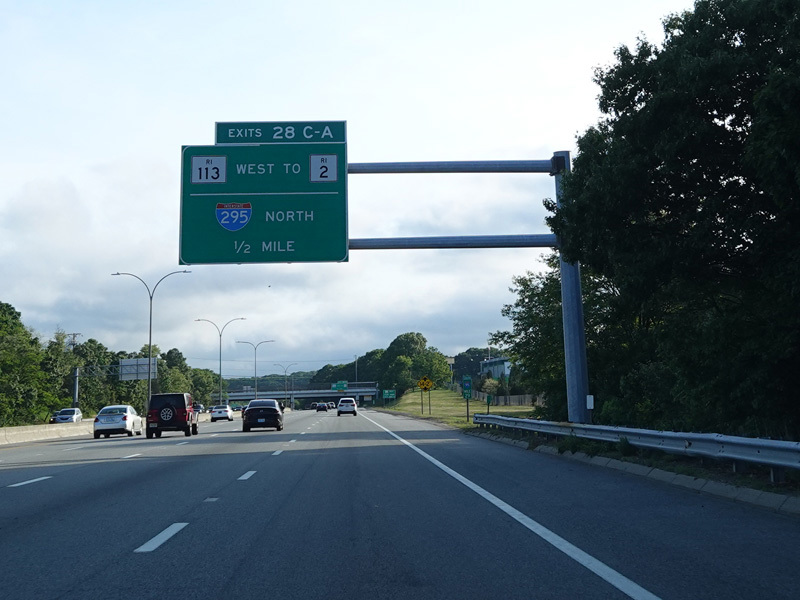 Exits 28C-A are for East Avenue (RI 113) west, Bald Hill Road (RI 2), and the Providence Beltway (I-295). Exit 28B is for East Avenue (RI 113) east and Greenwich Avenue (RI 5).