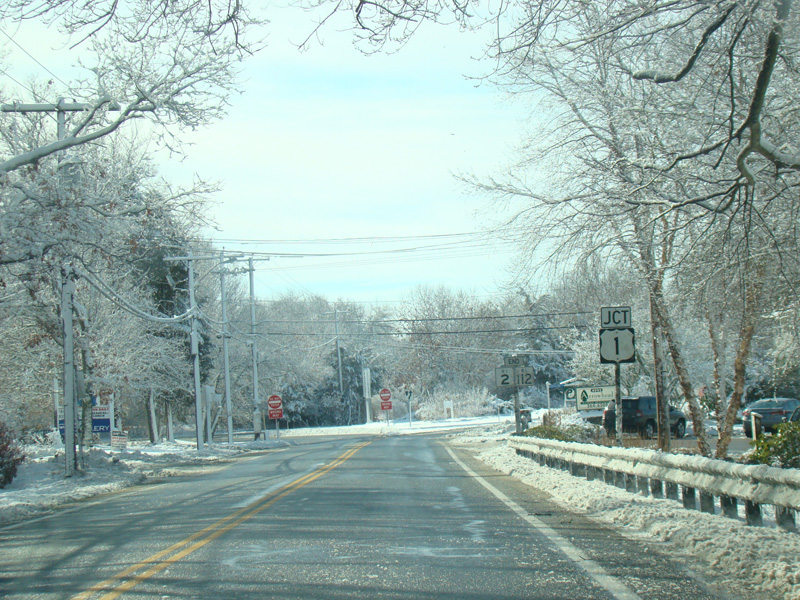 South County Trail ends here at Post Road (US 1). All motorists must merge in going south. Those wishing to go north must get into the southbound lanes and then use one of the turnarounds. This is the southern terminus of both RI 2 and RI 112.