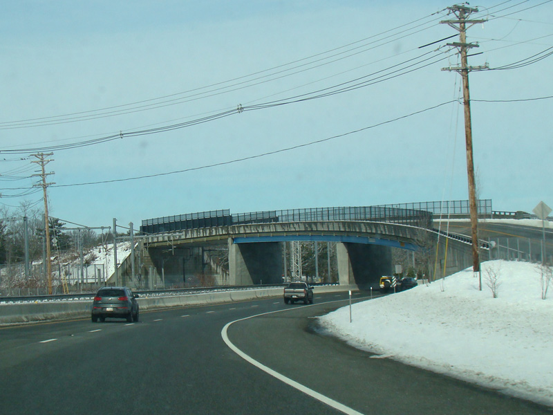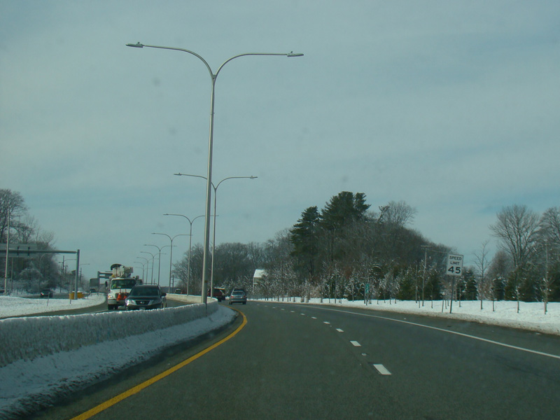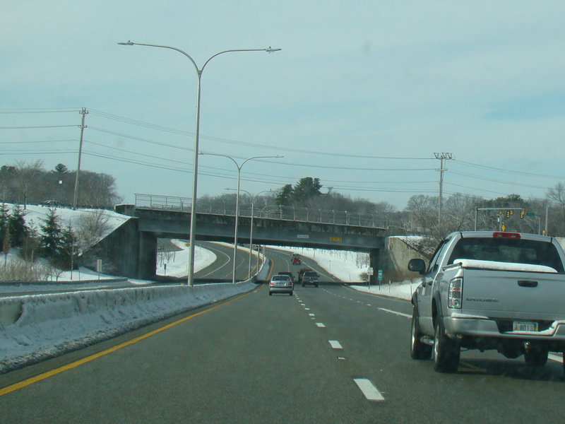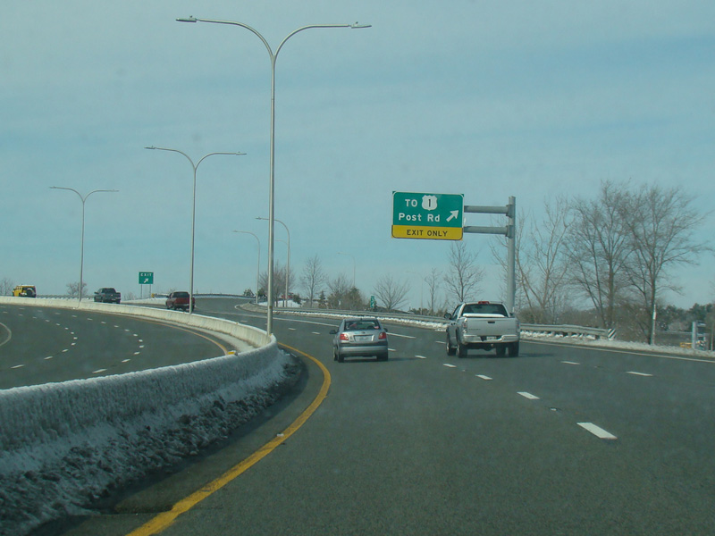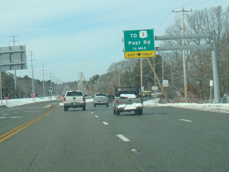 Roger Williams Way turns into RI 403 at its intersection with Commerce Park Drive. There is an exit for Post Road (US 1).