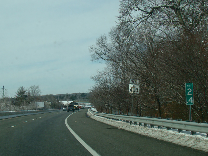 RI 403 continues west to end at the Colonel Rodman Highway (RI 4). Bear left to go south or right to go north toward I-95.