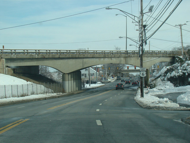 US 6 is a major east/west route crossing the country from Bishop, California, to Provincetown, Massachusetts. It is one of the longest routes in the country, longer than any interstate highway. In Rhode Island, it crosses the northern area of the state. From the Connecticut border, it follows Danielson Pike, Scituate Bypass, and Hartford Pike. In Johnston, Hartford Pike becomes Hartford Avenue. There is an interchange with the Providence Beltway (I-295), and US 6 leaves Hartford Avenue to be multiplexed with I-295. Hartford Avenue continues east as US 6A. One exit to the south, US 6 splits off from I-295 to run east for a couple of miles as an expressway to the Huntington Expressway (RI 10). It is then multiplexed with RI 10 north, I-95 south, and I-195 east. It splits off just before the Massachusetts border and follows Warren Avenue and Highland Avenue into Massachusetts.