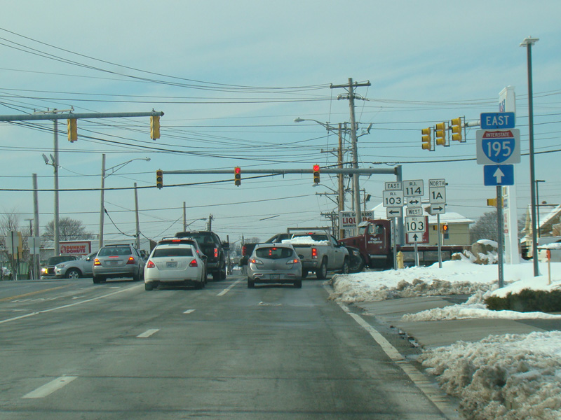 There is a traffic light at Pawtucket Avenue (RI 114). Turn right to go north or left to go south. RI 103 is also part of this intersection. Turn left on Pawtucket Avenue to go east or continue straight ahead on Warren Avenue to go west.