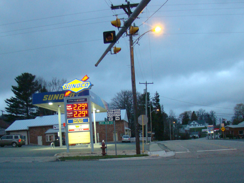 Skipping north to Monterey, there is a flasher at West Main Street (US 250). Turn right to go east or left to go west.