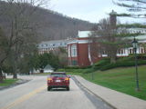 The median ends. North Alleghany Avenue narrows down to two lanes and changes names to become Hot Springs Road.
