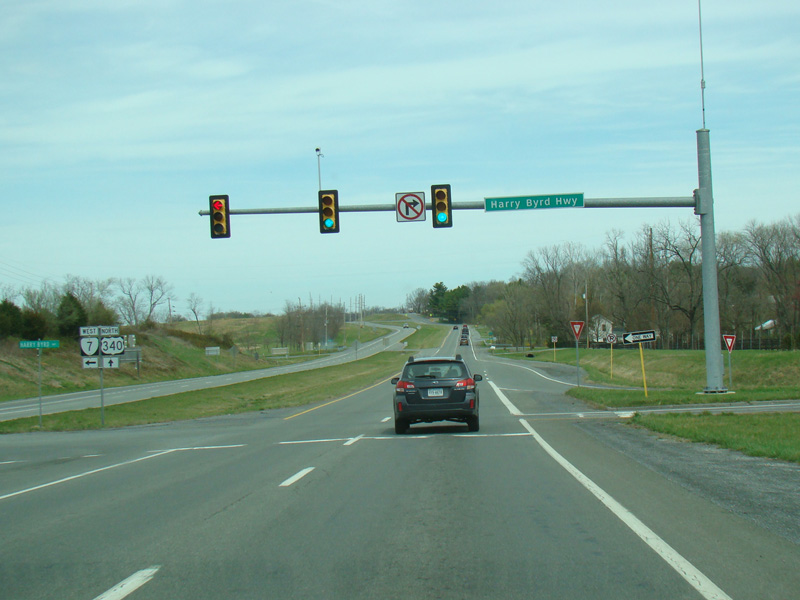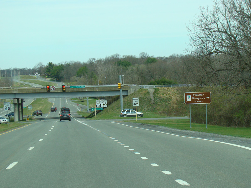 Lord Fairfax Highway widens to become a four-lane divided highway. There is an interchange with Harry Byrd Highway (VA 7).