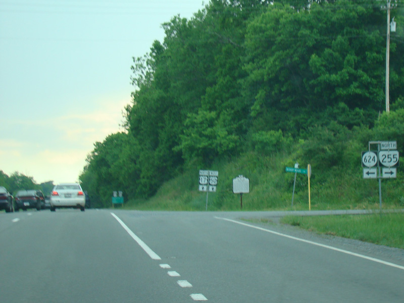 Bishop Meade Road (VA 255) begins on the right at an uncontrolled intersection. Red Gate Road (SR 624) is to the left.