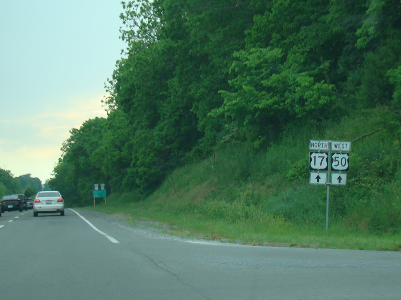 John Mosby Highway widens to become a four-lane divided road again. There is a traffic light at US 17. Turn left onto Winchester Road to go south. US 17 north is multiplexed with US 50 west along John Mosby Highway straight ahead.