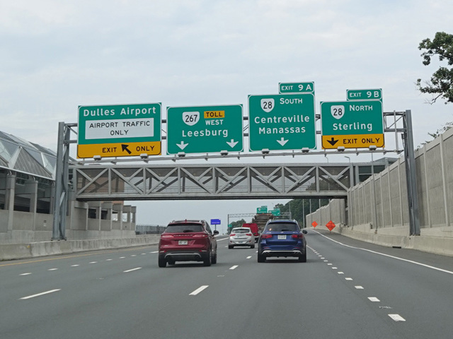 The Dulles Greenway and the Dulles Toll Road each have their own set of mileposts, with the mileage resetting as VA 267 transitions from one highway to another. However, the exit numbers use one numbering scheme along the entire length of VA 267. That numbering scheme is sequential, which is unusual for Virginia, a state that uses the milepost system.