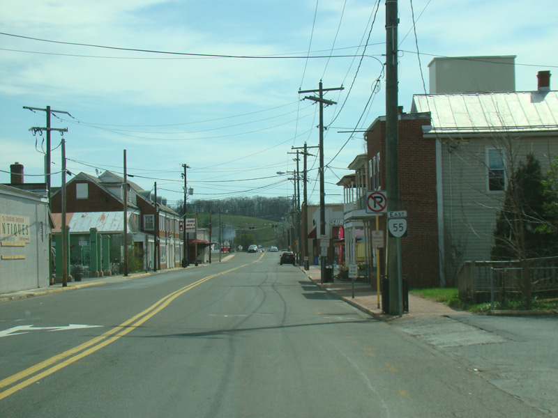 VA 55 turns east again onto King Street. Heading out of Strasburg, King Street changes names to become Front Royal Road and begins to ascend into the mountains.