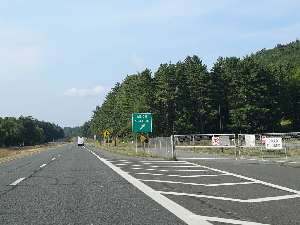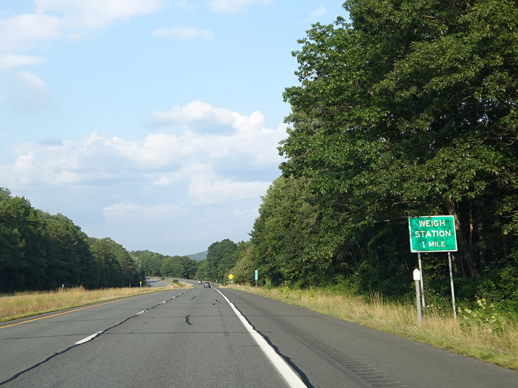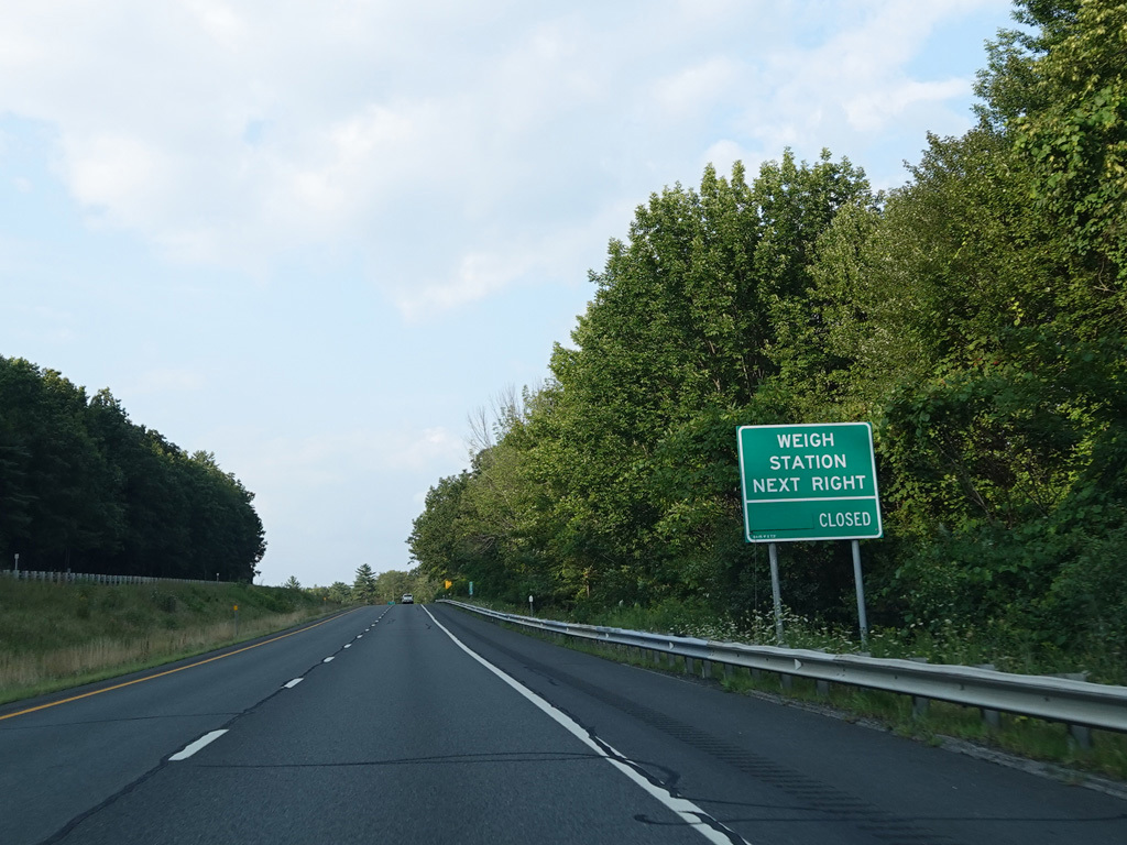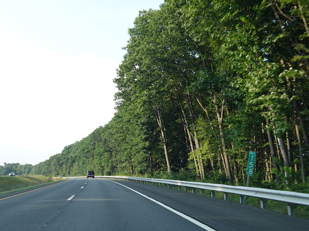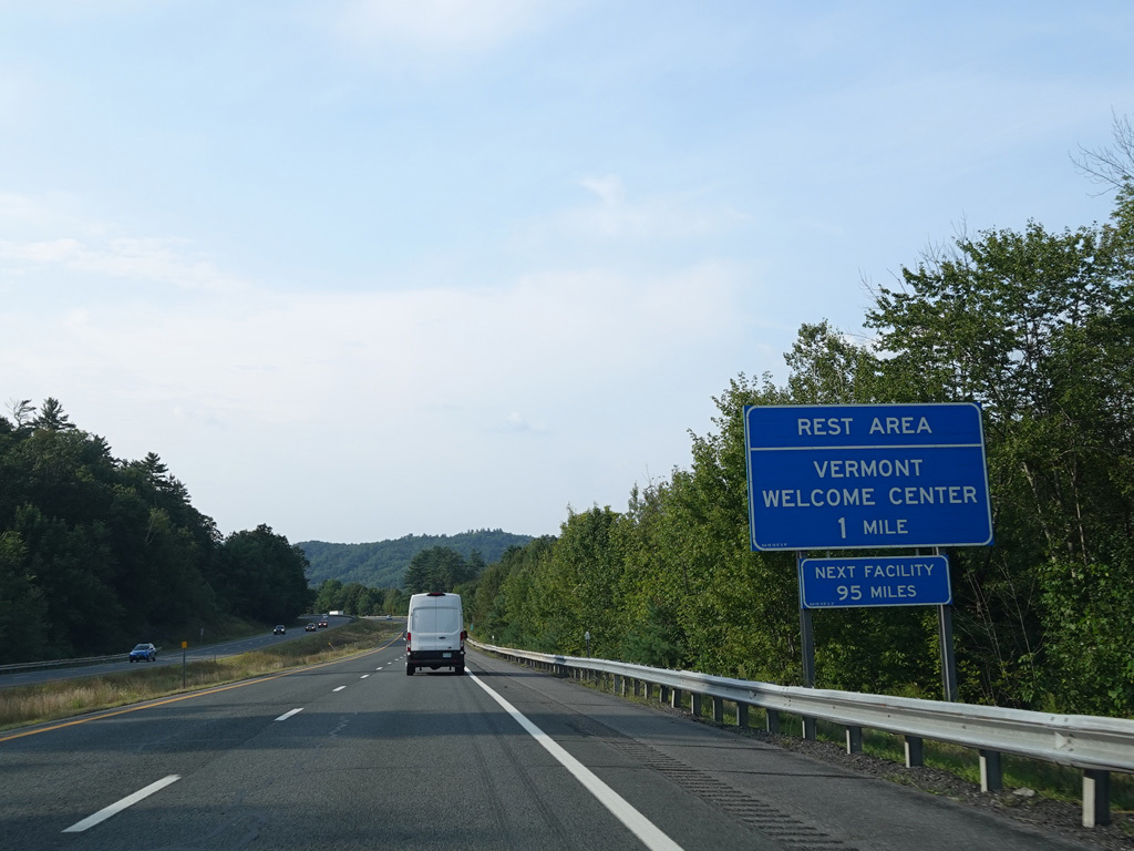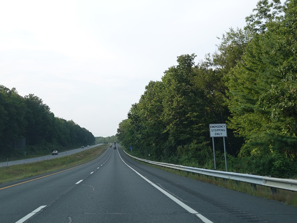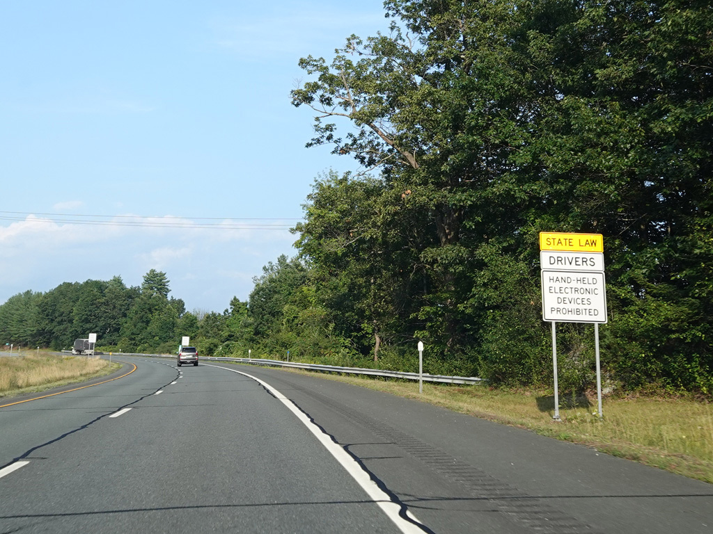 There are no exits for the first few miles in the state. There is signage in this area for various state laws, such as those on seatbelts, drunk driving, and cell phone use.