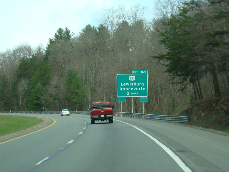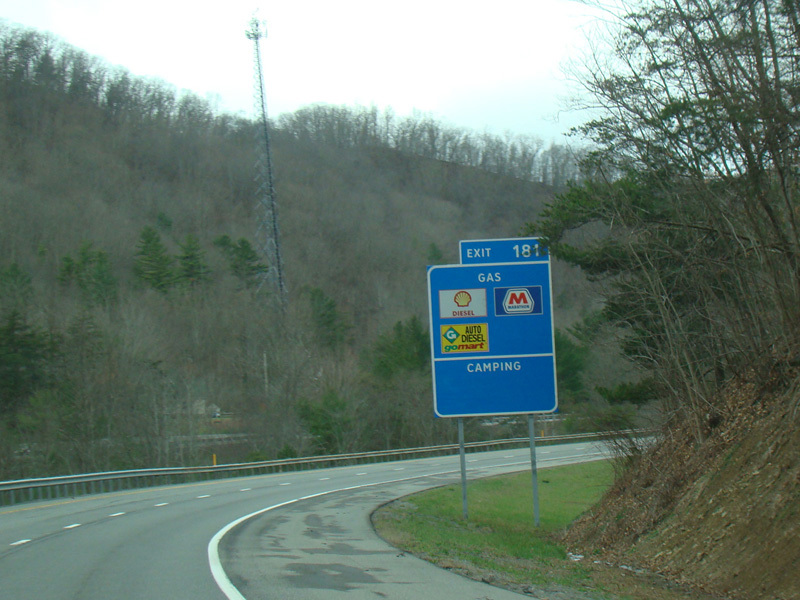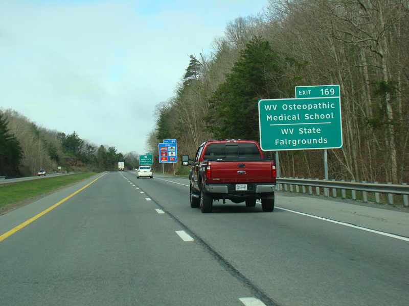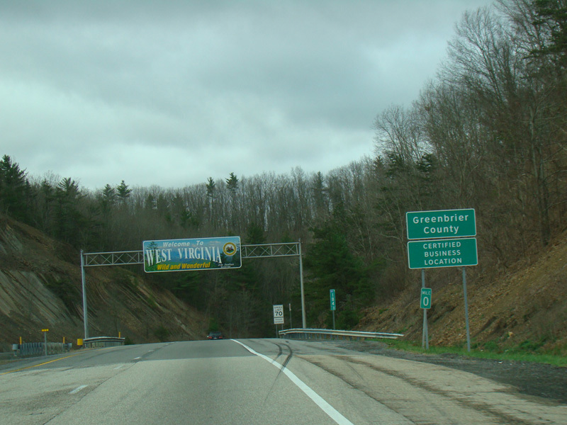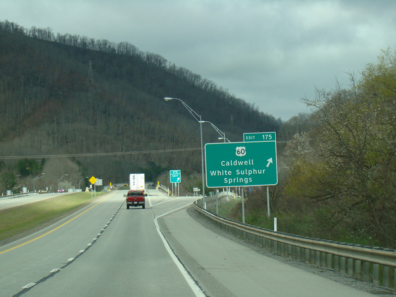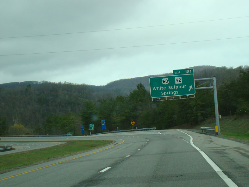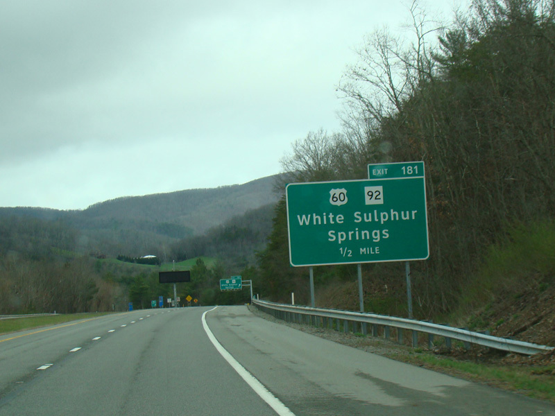 Welcome to West Virginia and to Greenbrier County! Exit 181 is for East Main Street (US 60) and Pocahontas Trail (WV 92).