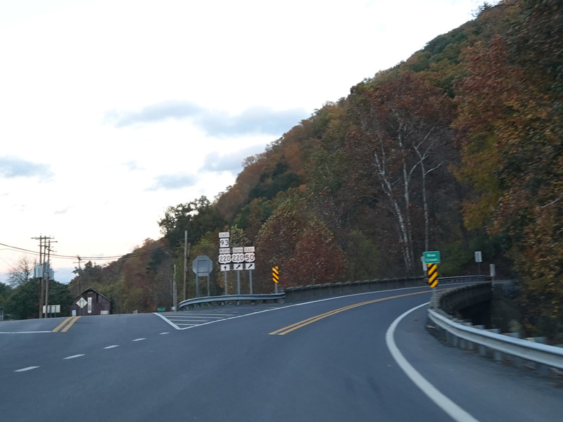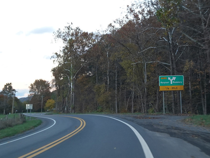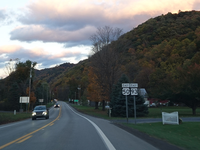The two routes split here. Bear left for New Creek Highway (WV 93) toward US 220 north. Bear right for US 50 toward US 220. The signage here is not exactly accurate since the junction with US 220 is not for another mile.