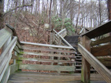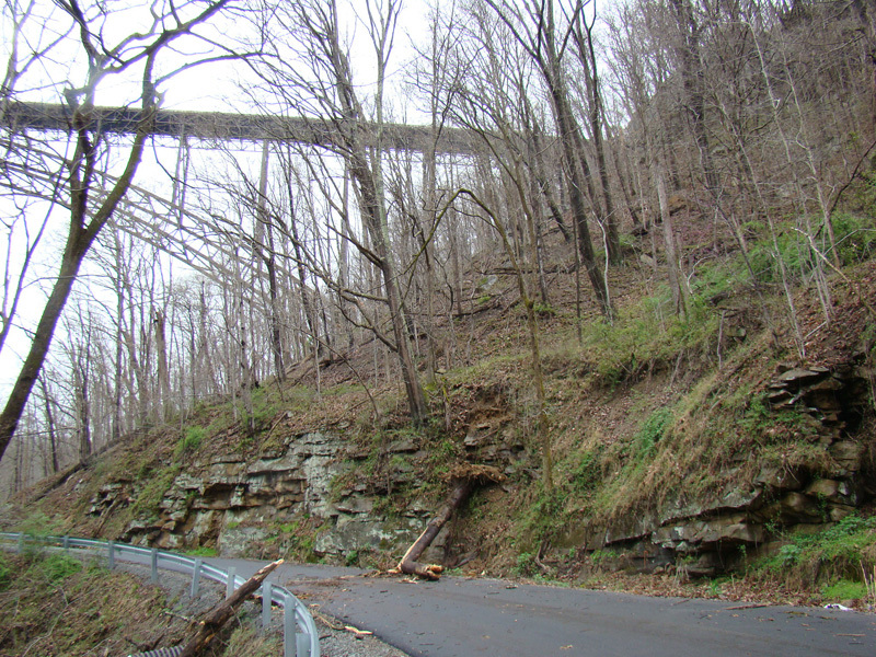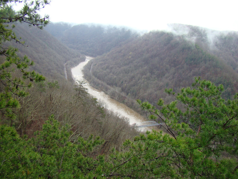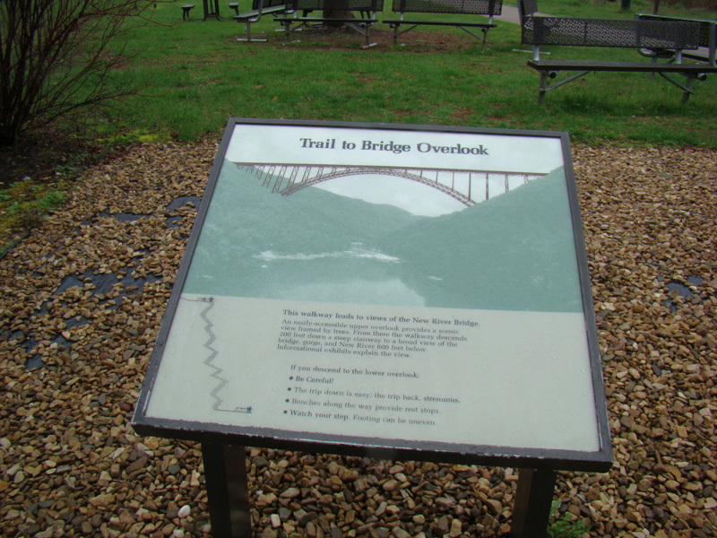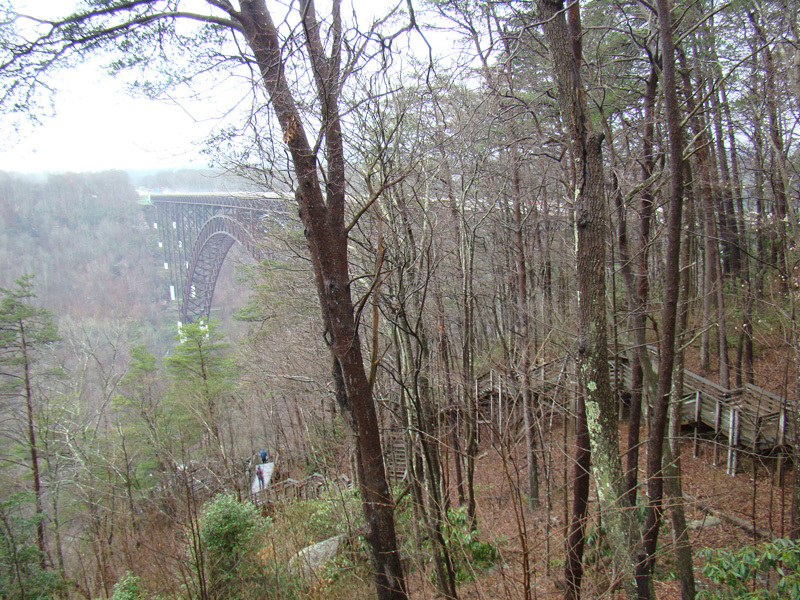 From the visitor center for the New River Gorge National River, there is a trail consisting of a long wooden staircase descending into the gorge leading to a viewing platform with views of the New River Bridge. The small bridge at the bottom of the gorge is Fayette Station Road (CR 82).