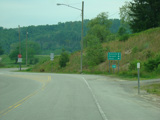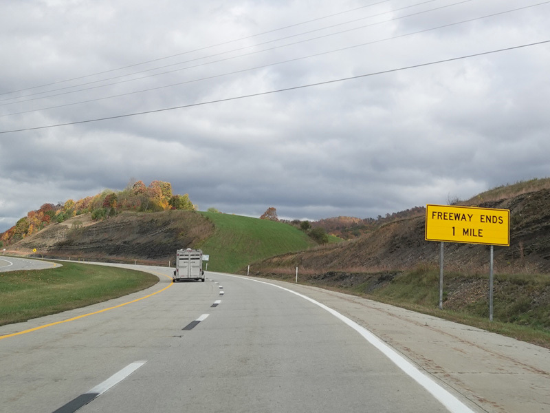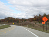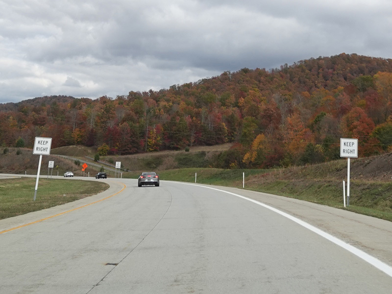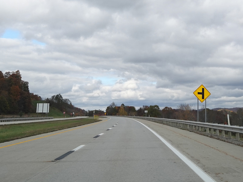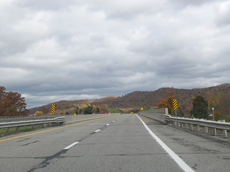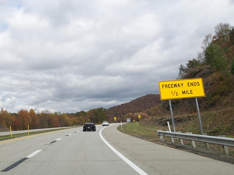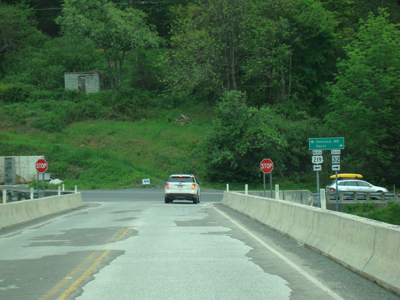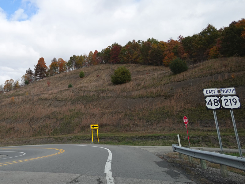The western section of Corridor H ends here. Turn right to stay on US 48/US 219. Straight ahead, there is a bridge that has been constructed but not yet opened to traffic.
