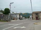 First Street runs east as a two-lane undivided road. There is a bridge over the Cheat River.