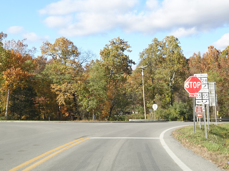 The two routes split at a stop sign. Turn left to stay on US 33 or bear right to stay on WV 28. WV 55 is multiplexed with US 33 to the west and WV 28 to the east.