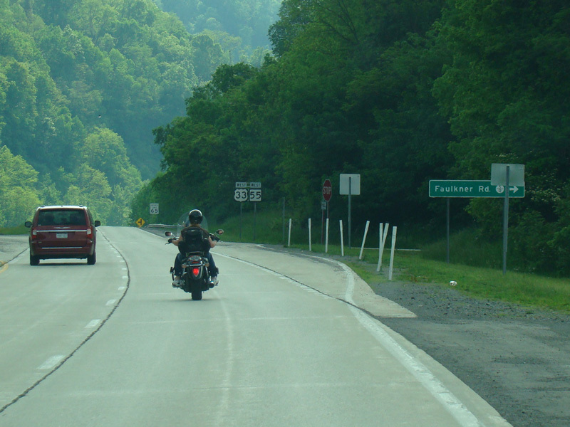 In Bowden, US 33/WV 55 becomes a four-lane divided highway for a short distance. There are at-grade intersections at Faulkner Road (CR 5/12), Kelly Mountain Road (CR 25), and Old Route 33 (CR 33/8).