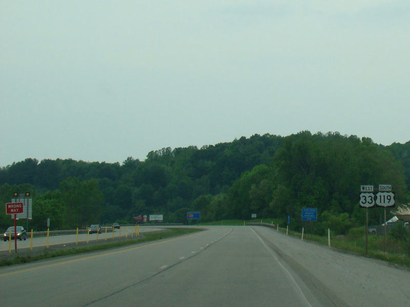 The median ends, and US 33/US 119 narrows down to become a two-lane undivided road.