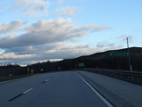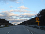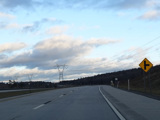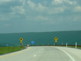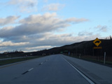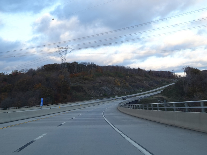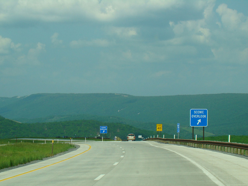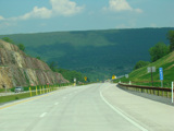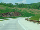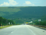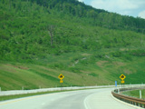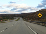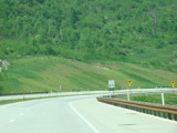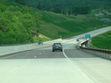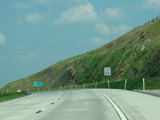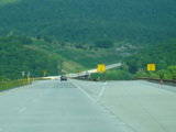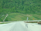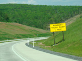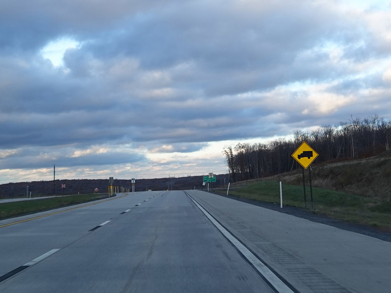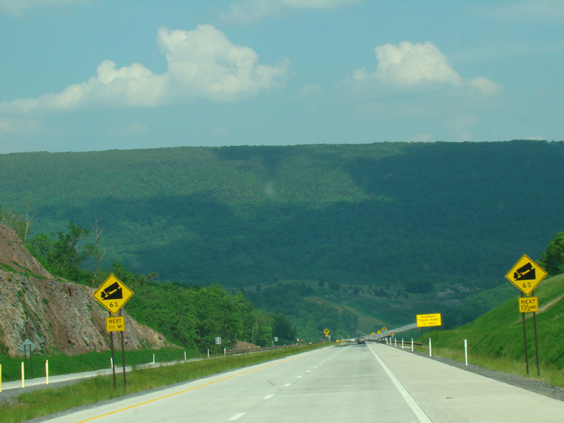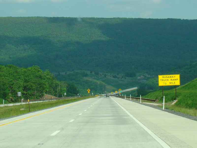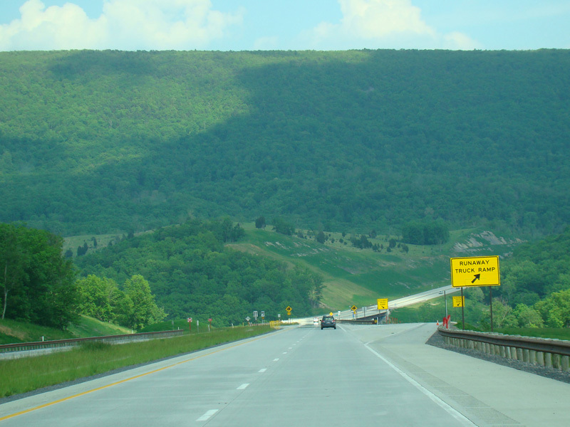 The highway slopes down at a fairly steep grade. Near the bottom, there is a runaway truck ramp.