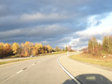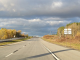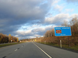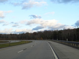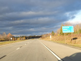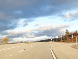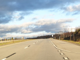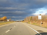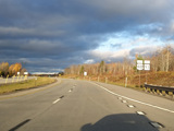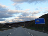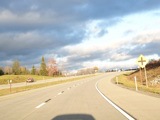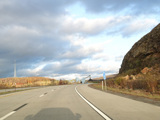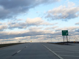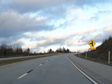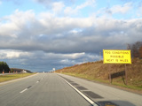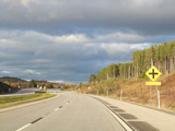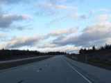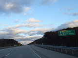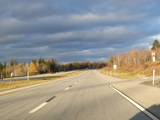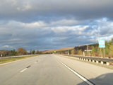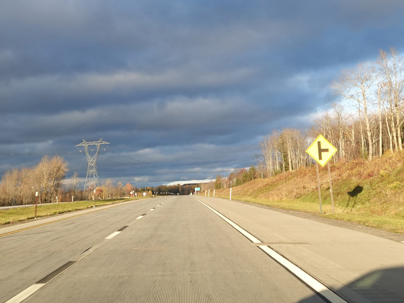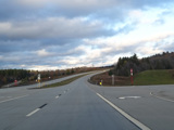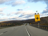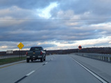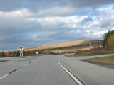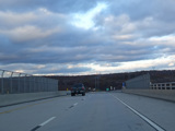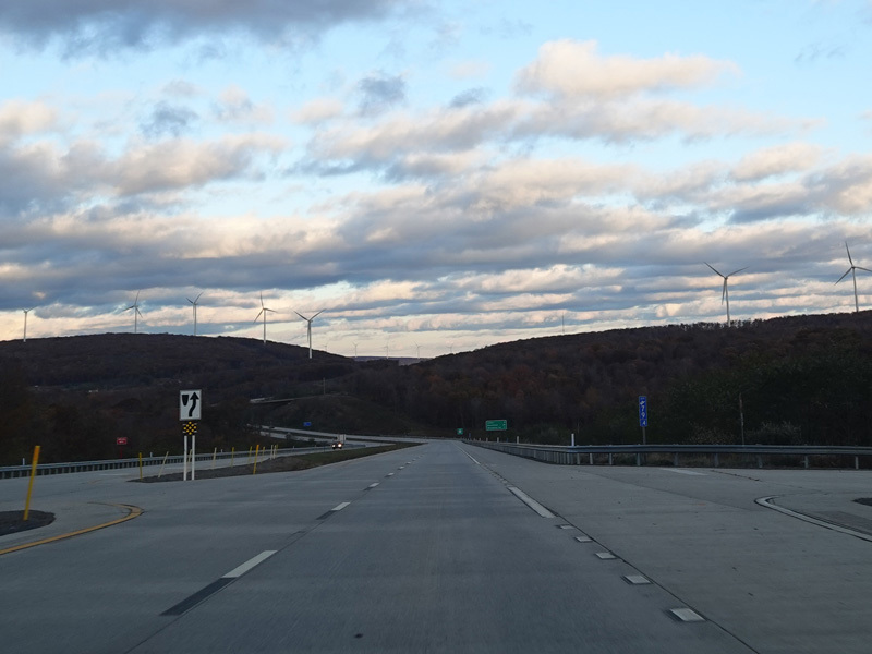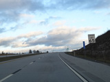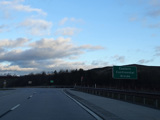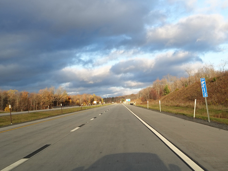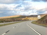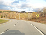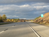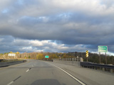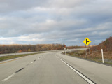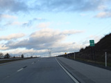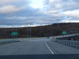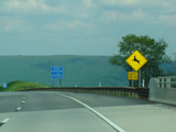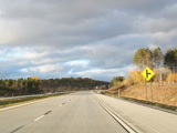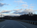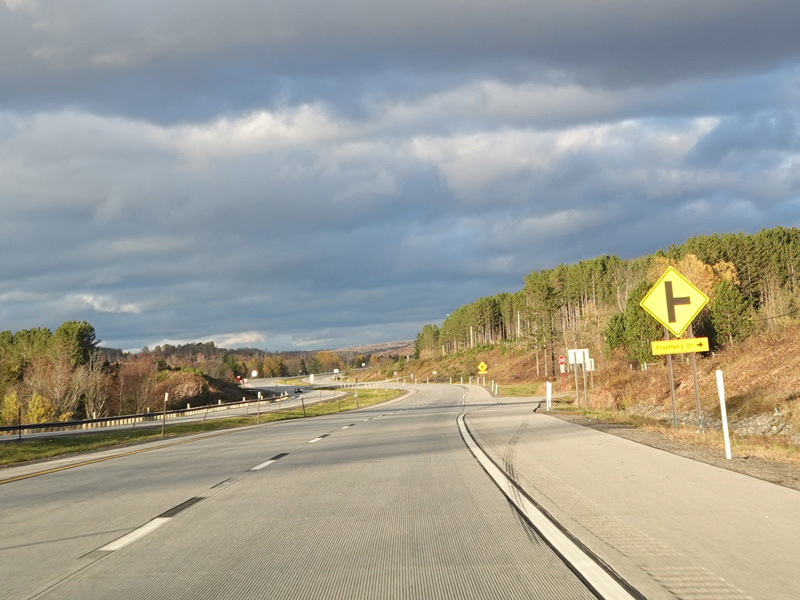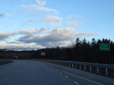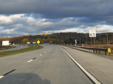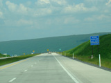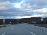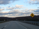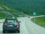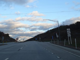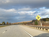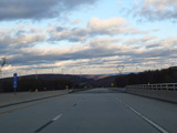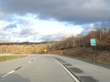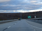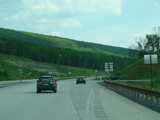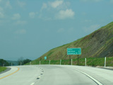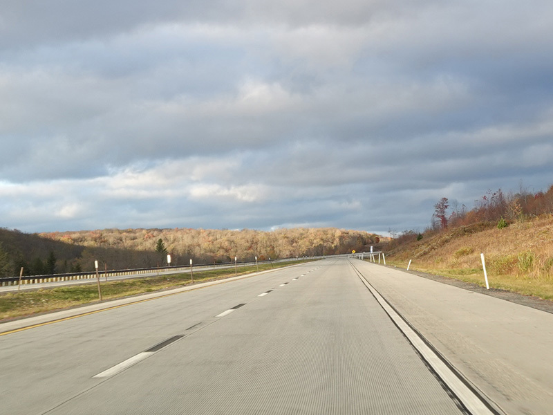 The highway slopes down at a fairly steep grade. Near the bottom, there is a runaway truck ramp.