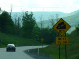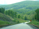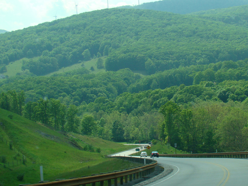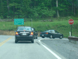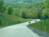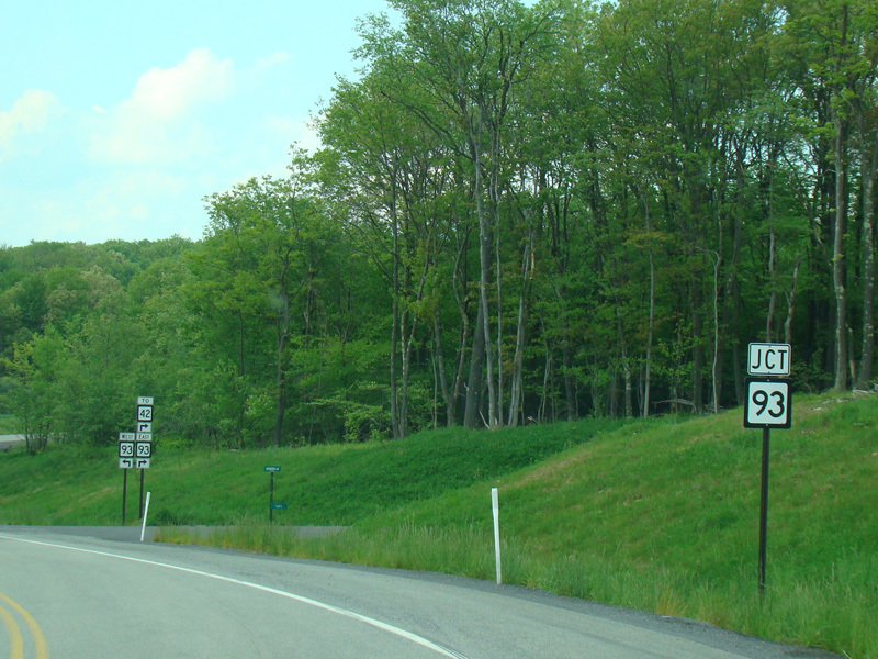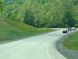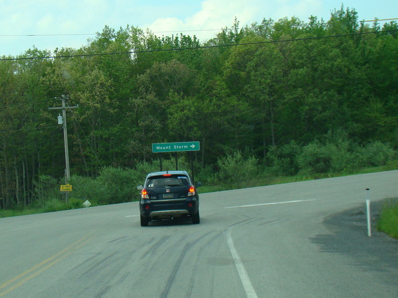 The turnoff for Laurel Dale Road (WV 93) leads to this roadway, which extends about half a mile down the mountain at a very steep grade to end at a stop sign. Turn right to go east or left to go west.