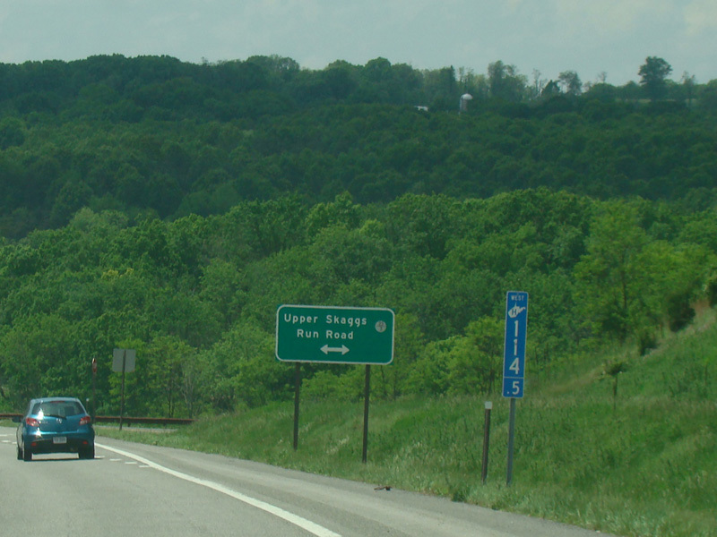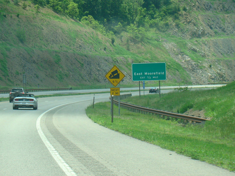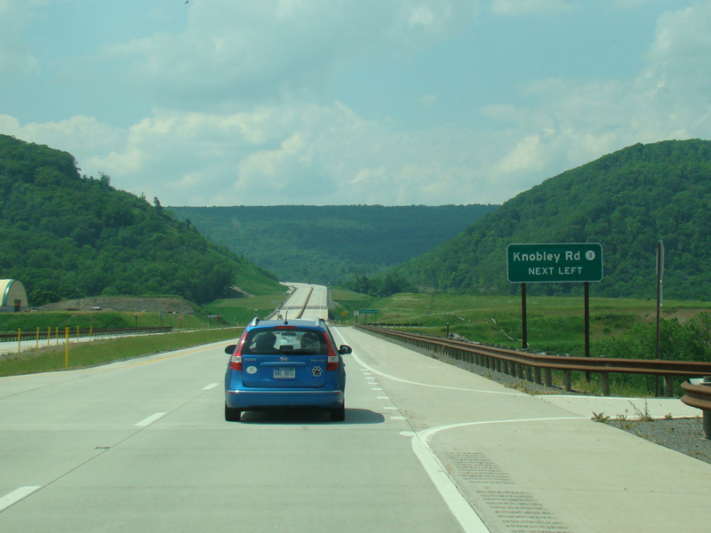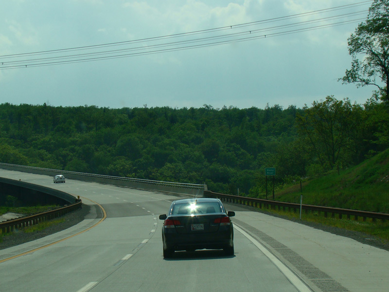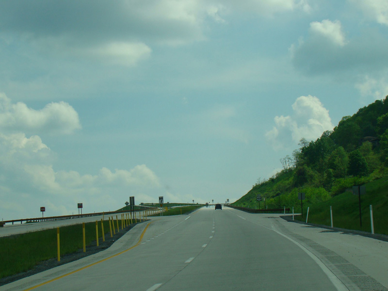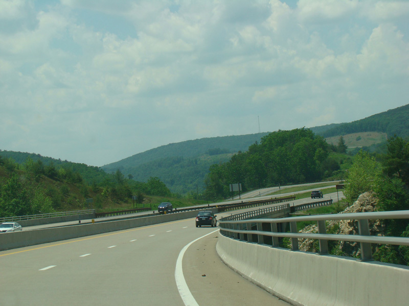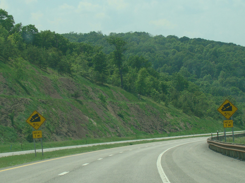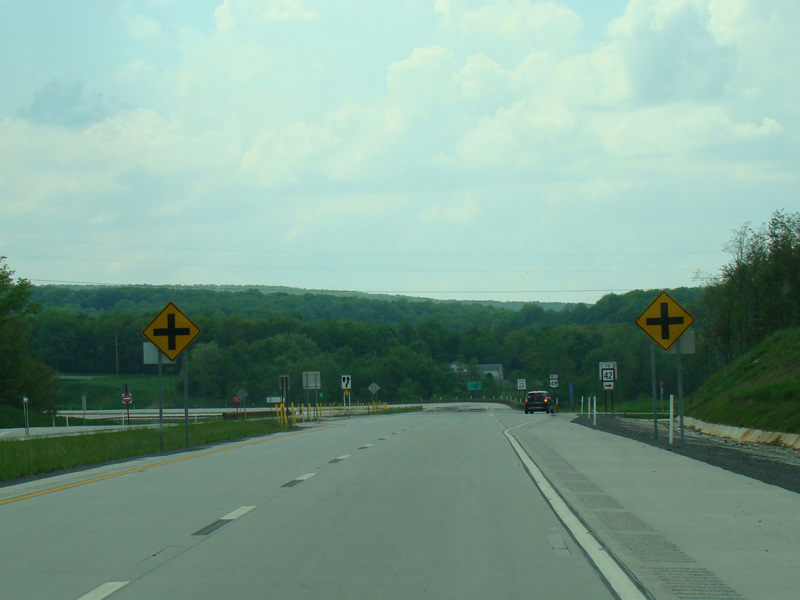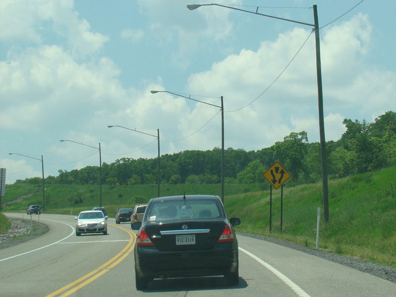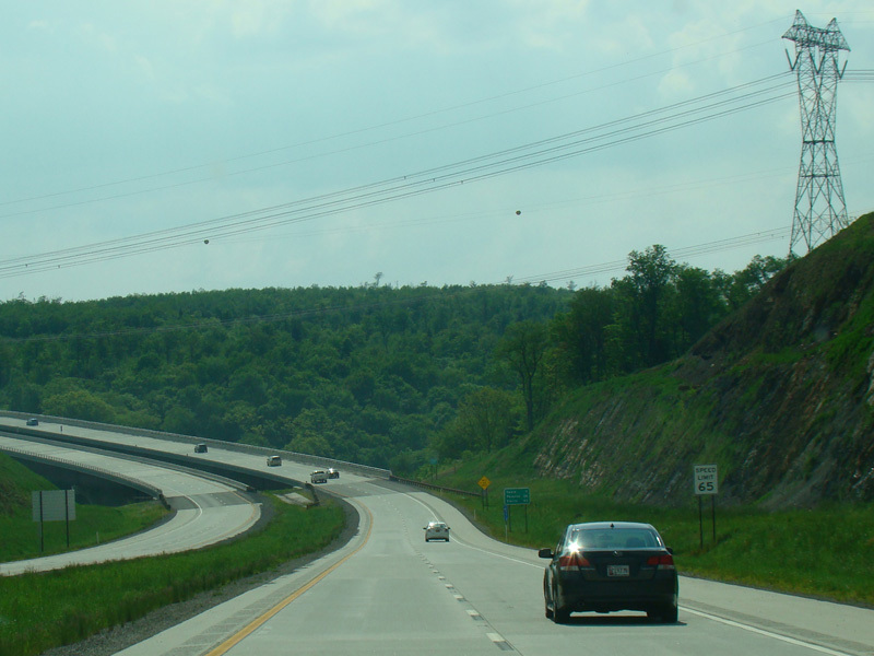 There are some at-grade-intersections along this stretch, including at Thorn Run Road (CR 5/4) and Knobley Road (CR 3), as well as some cliffs.