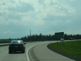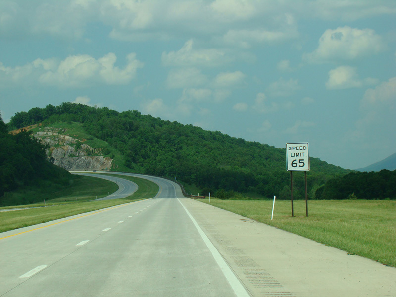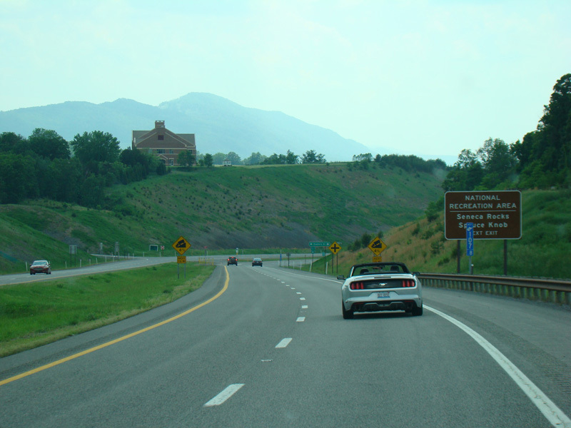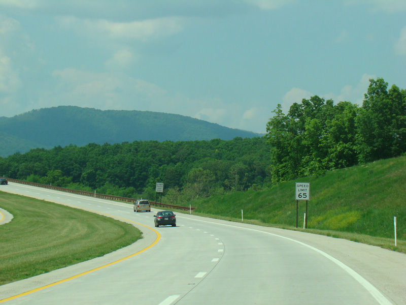 Corridor H begins here as the road widens to become a four-lane divided highway with a 65 MPH speed limit. There is an at-grade intersection at Squirrel Gap Road.