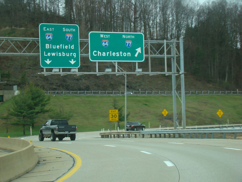 The ramp from Robert C. Byrd Drive to the West Virginia Turnpike (I-64/I-77) splits. Bear right to go north or left to go south.