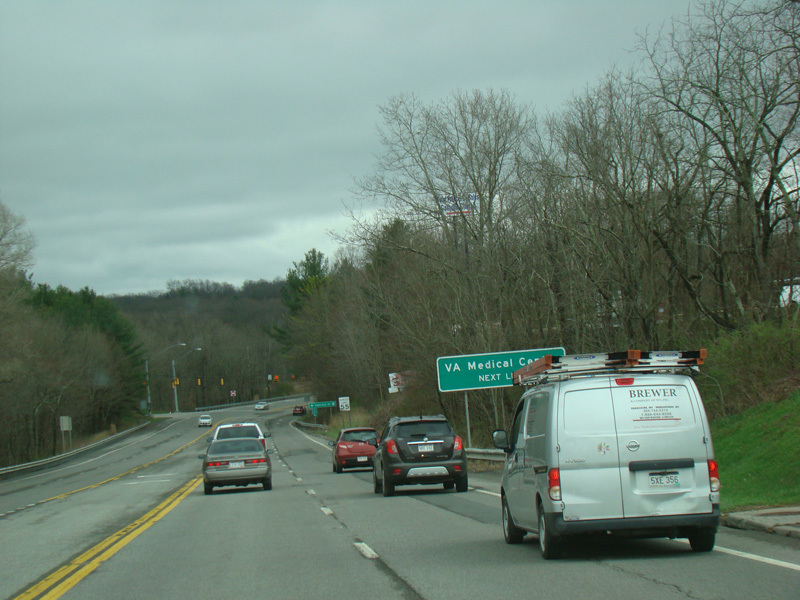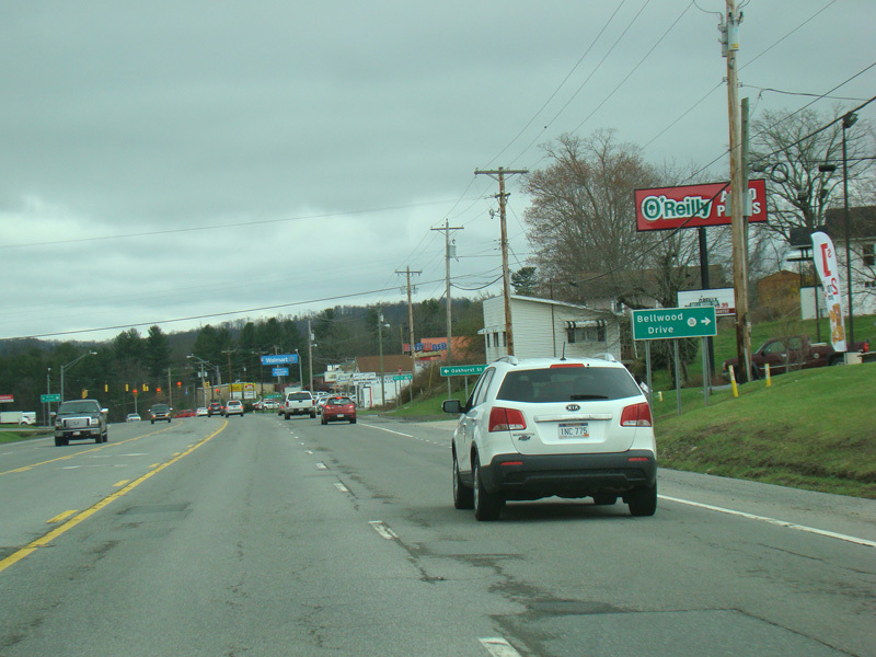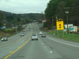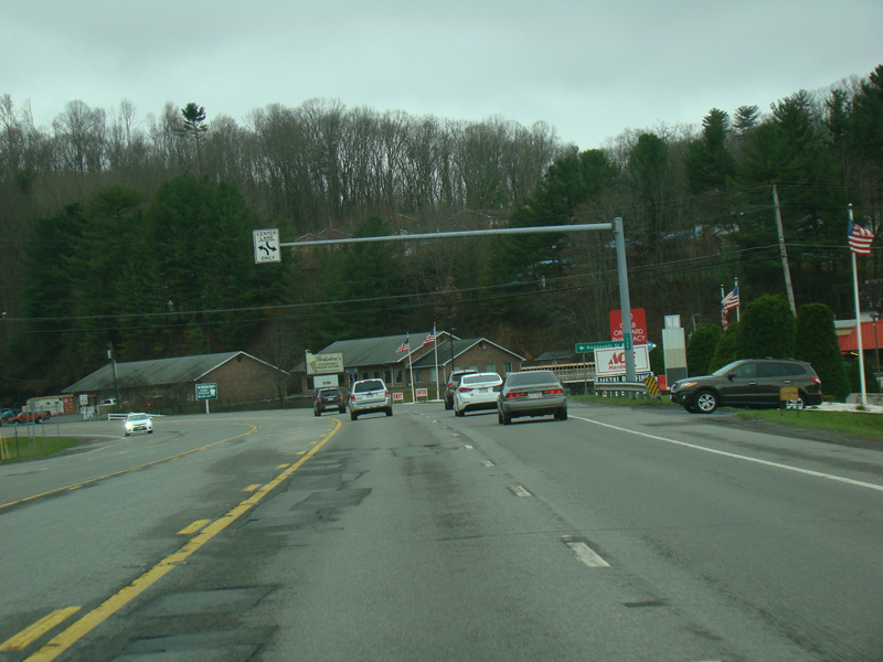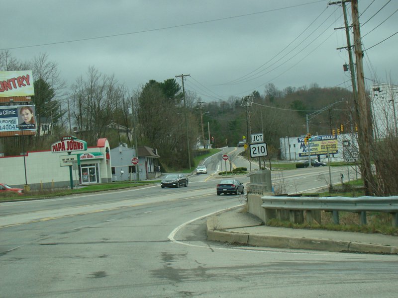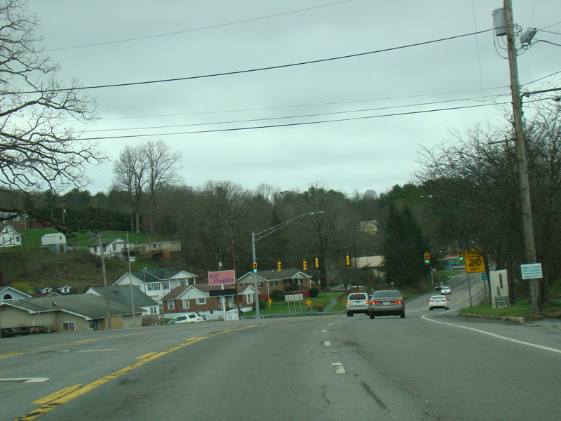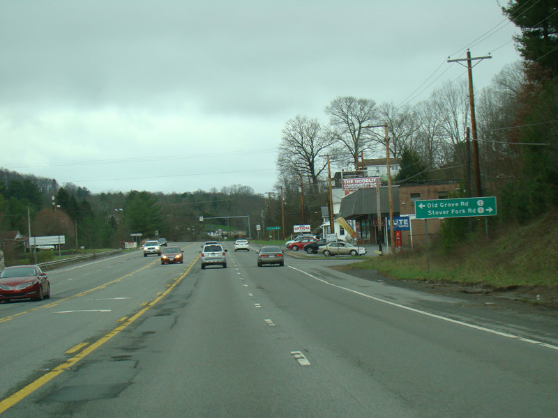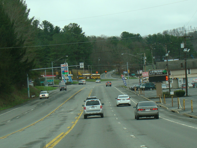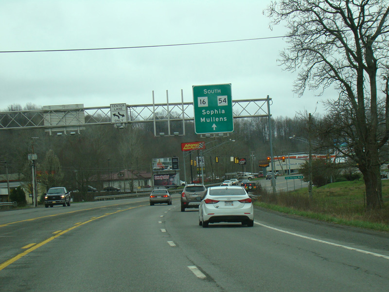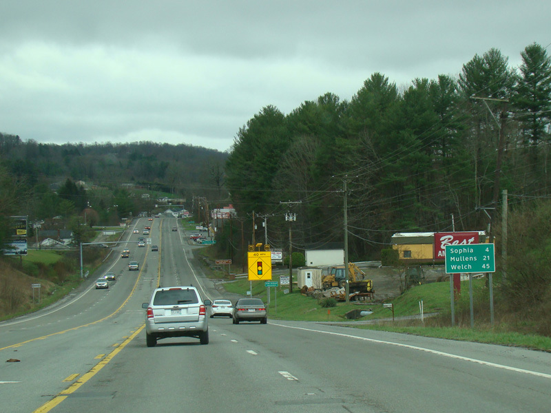 The roadway splits. Bear right to stay on Robert C. Byrd Drive toward Lester Highway (WV 54). The Coalfields Expressway (WV 121) begins straight ahead. There is currently no signage for it, either by name or by number, because it currently ends a few miles from here.