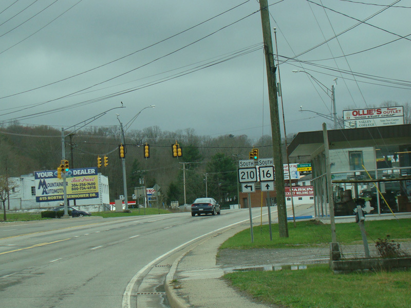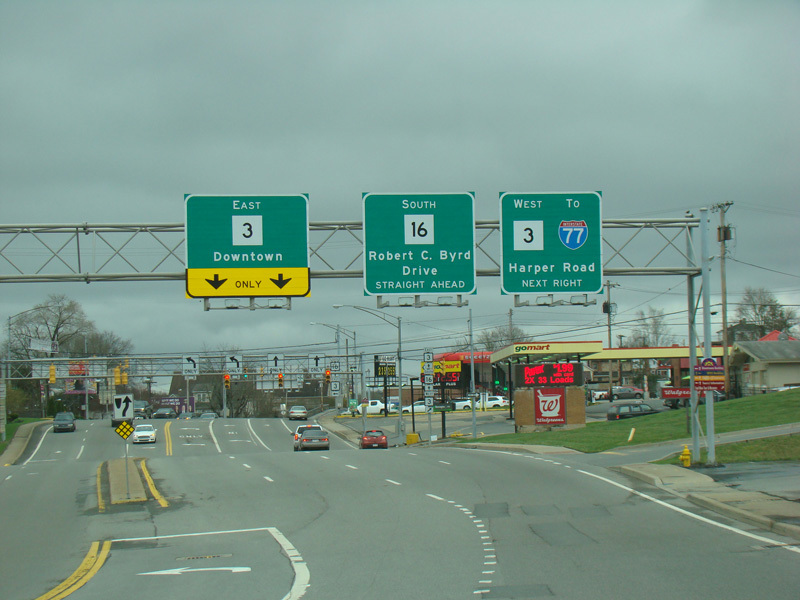 WV 16 splits off from Eisenhower Drive (US 19) and runs south as Robert C. Byrd Drive, a four-lane undivided road. There is a traffic light at Market Road (CR 21/4).